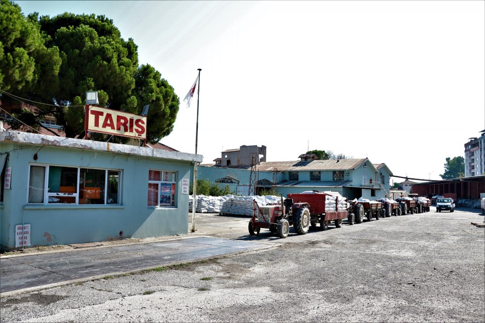 TARİŞ depolarında da üzüm alımları başlarken, çiftçilerin traktörleri uzun kuyruklar oluşturdu. TARİŞ’te de ekspertizler tarafından numaralandırılan üzümler depolara yerleştirildi.