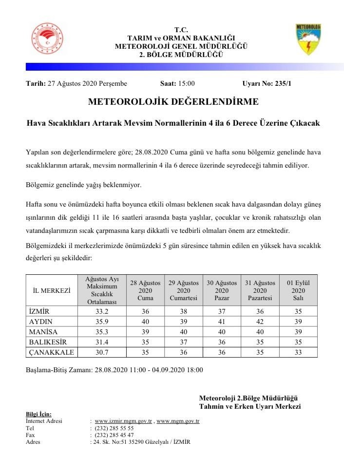 Meteoroloji 2. Bölge Müdürlüğünden yapılan açıklamada, yapılan son değerlendirmelere göre bugünden itibaren hafta sonu itibari ile sıcaklıkların 4-6 derece üzerinde seyredeceği tahmini yaptı. Meteorolojiden yapılan açıklamada; " Bölgemizde (İzmir, Çanakkale, Balıkesir, Manisa ve Aydın) hava sıcaklıklarının 28.08.2020 tarihinden itibaren 4 ila 6 C artarak mevsim normallerinin üzerinde seyretmesi tahmin edilmektedir. Yüksek sıcaklığın yol açabileceği olumsuzluklara karşı ilgililerin ve vatandaşların dikkatli ve tedbirli olmaları tavsiye edilmektedir. Sıcaklık artışının Başlama - Bitiş Zamanı 28.08.2020 / 11:00 - 04.09.2020 / 18:00 tarihleri arası olacağı açıklandı."