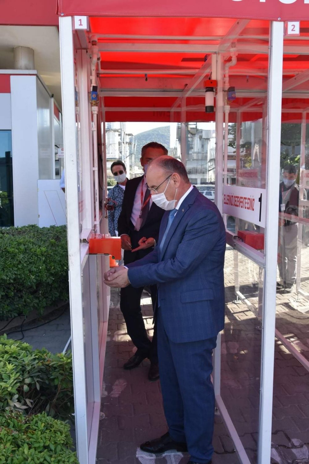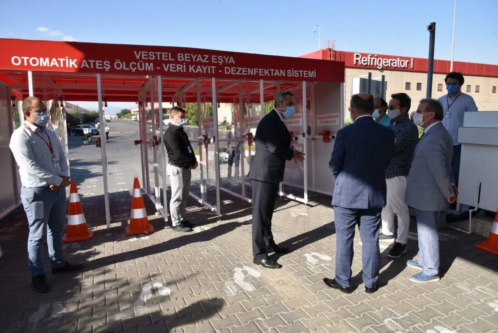 Vestel elektronik, buzdolabı, çamaşır makinesi tesisleri üretim bantlarını gezen Vali Karadeniz’e yazılım ve tasarımı Vestel’in bünyesinde ki Türk mühendisler tarafından yapılan yerli üretim Otomatik Ateş Ölçüm Veri Kayıt ve Dezenfektan Sistemi de tanıtıldı. Vali Karadeniz’e üretim ve kurulumu Vestel tarafından yapılan sistemin, fabrika, okul ve hastanelerde kullanıldığı bilgisini veren firma yetkilileri, sistem ile Vestel’in 8 ayrı kapısında 40 ayrı turnikeden günlük yaklaşık 20 bin ölçüm gerçekleştirildiğini de aktardı. Fabrikada çalışan personel ile de sohbet eden Vali Karadeniz, Zorlu Holding Yönetim Kurulu Başkanı Ahmet Nazif Zorlu ve fabrika yetkililerine çalışmalarında başarılar diledi.