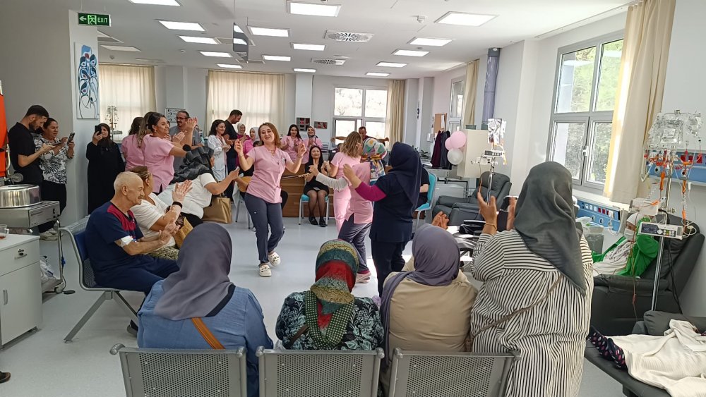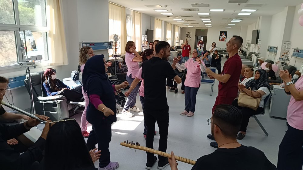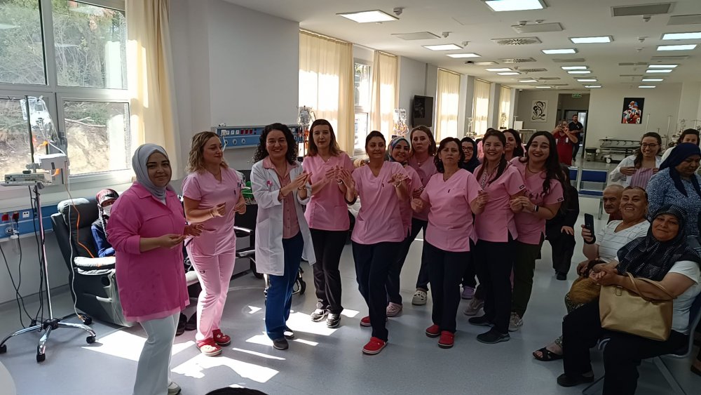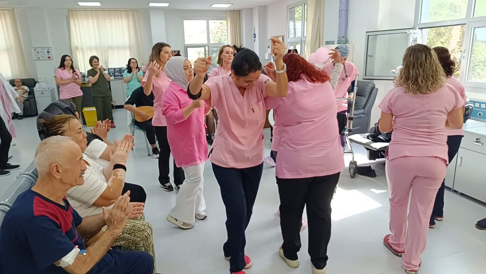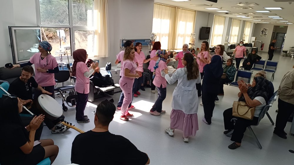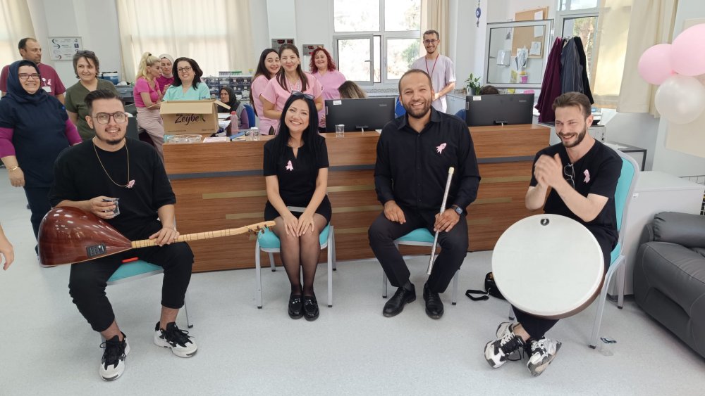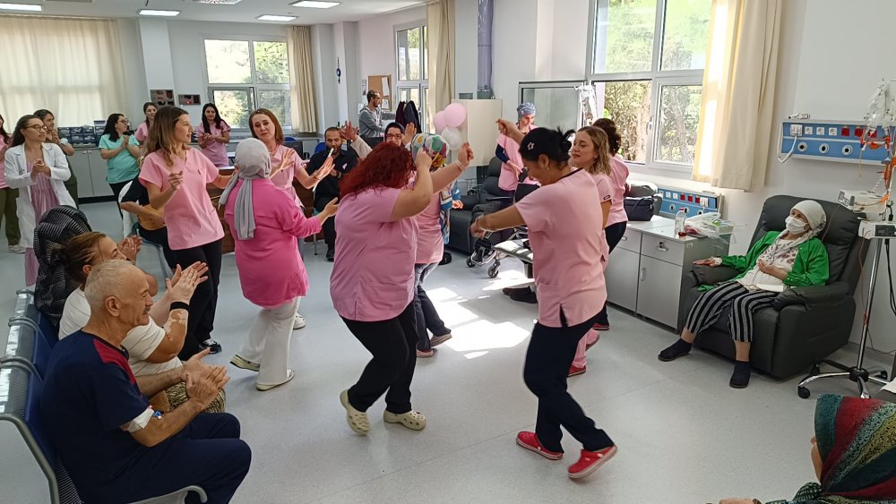 MCBÜ Onkoloji Ek Hizmet Binası Ayaktan Tedavi Ünitesinde "Onkoloji'de Pembe Saatler" etkinliği kapsamında Kemoterapi ünitesinde Türk Müziği dinletisi, Pembe kurdeleli Türk Kahvesi sunumu ve Kahkaha Yogası gerçekleştirildi.
