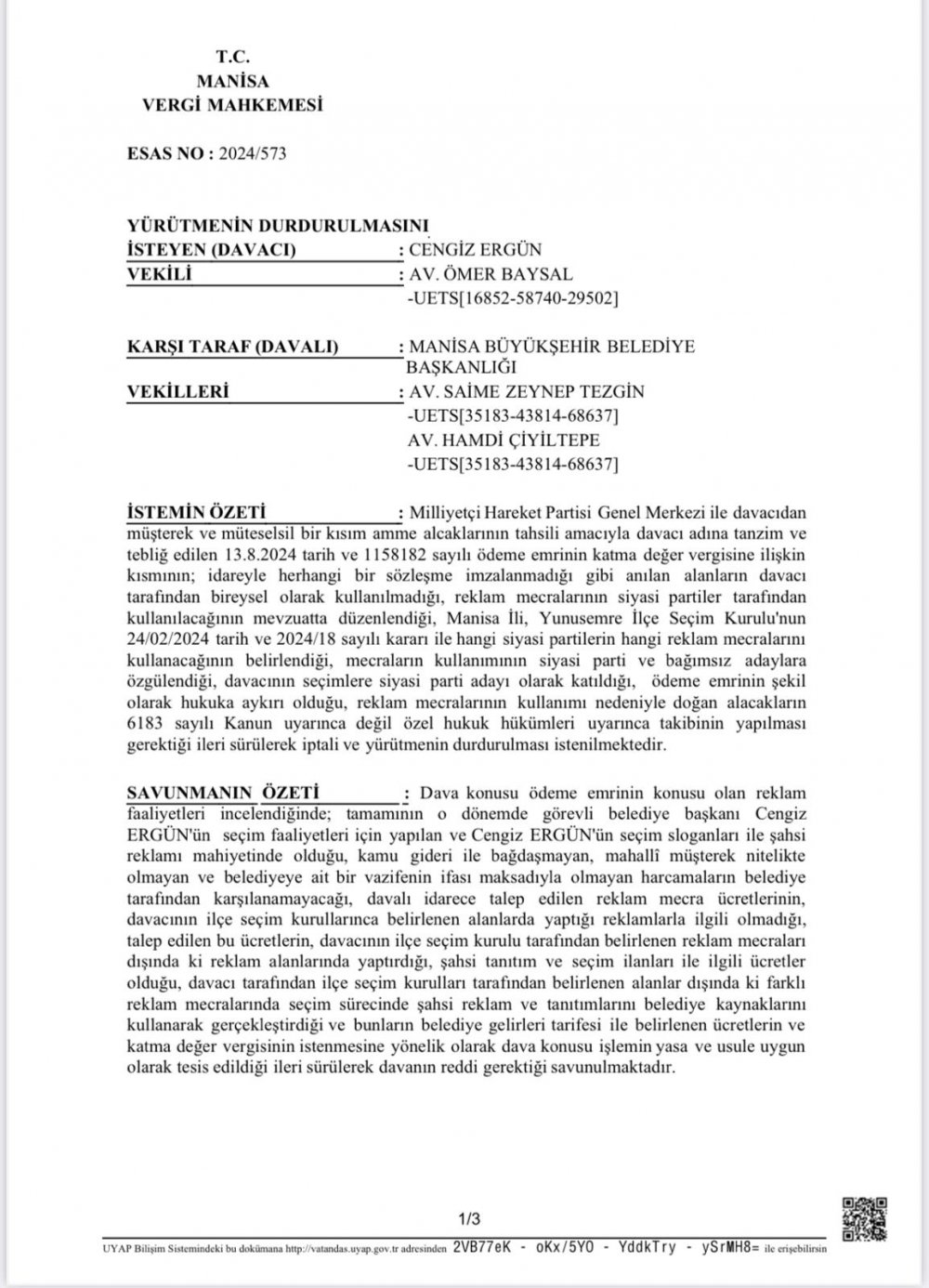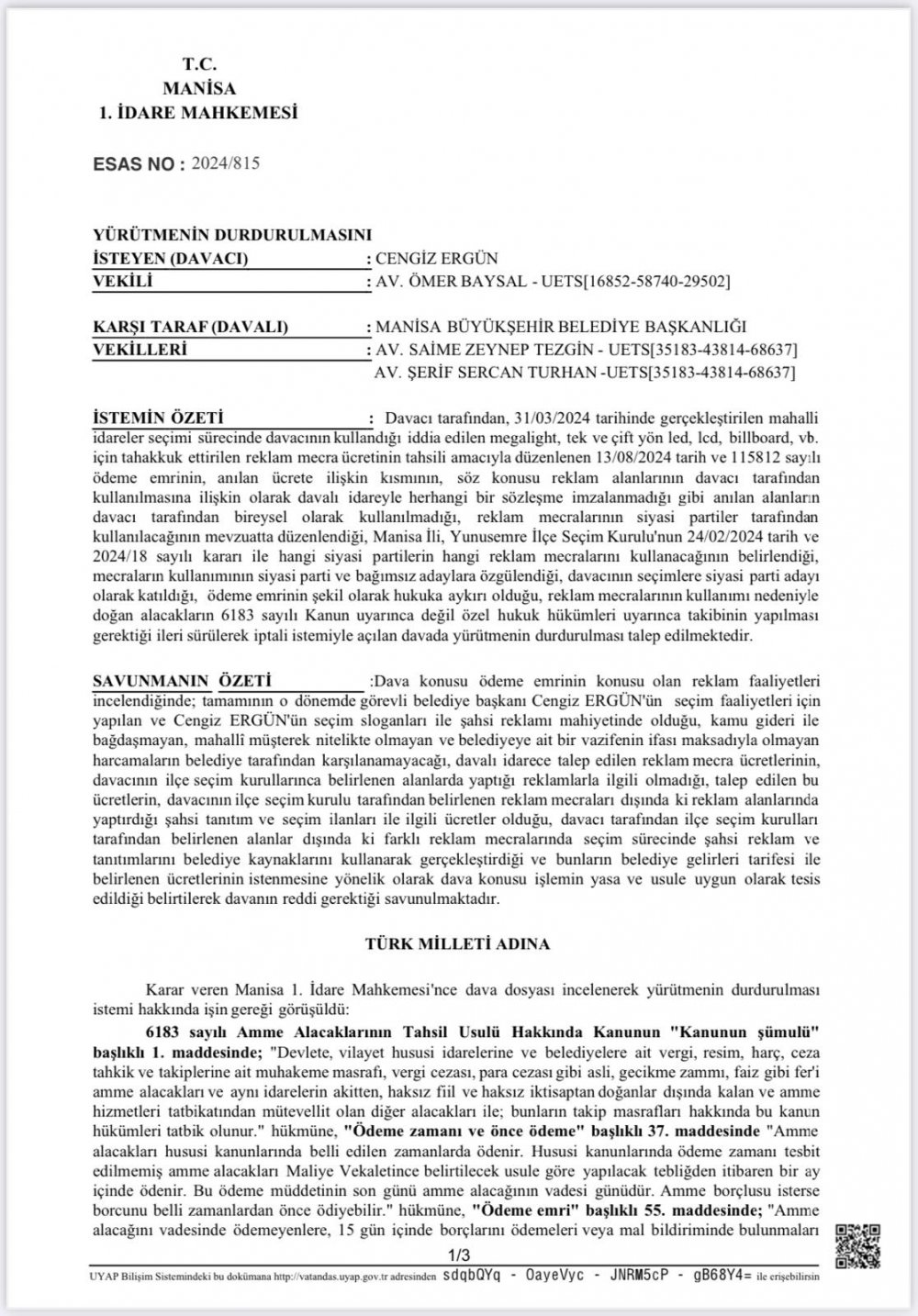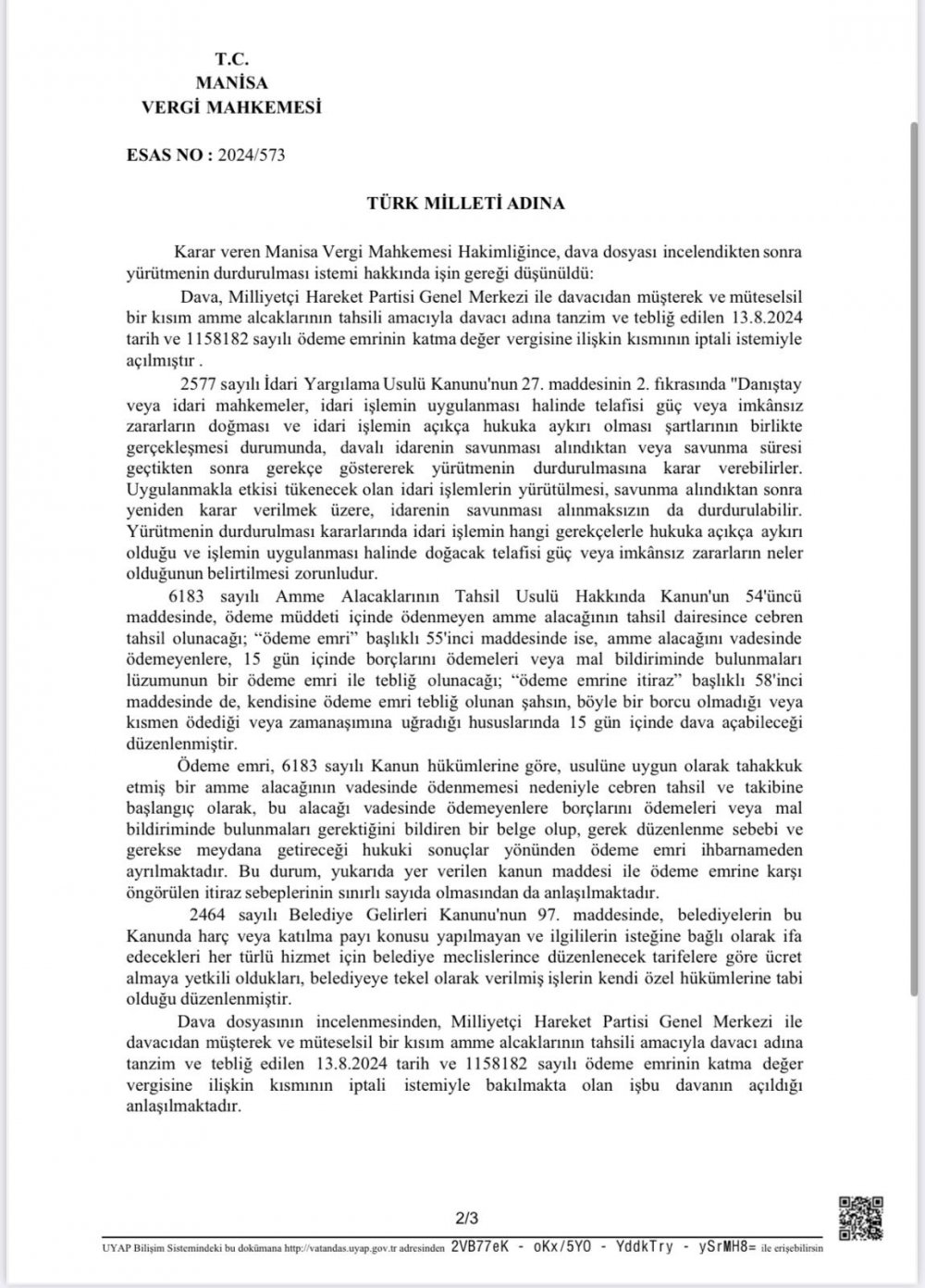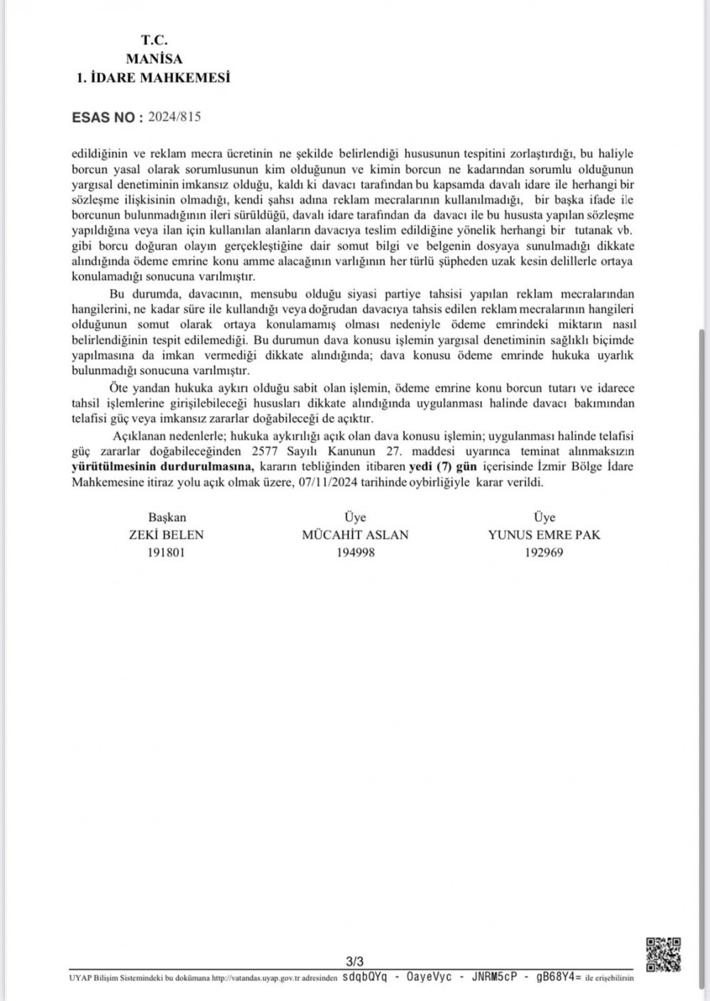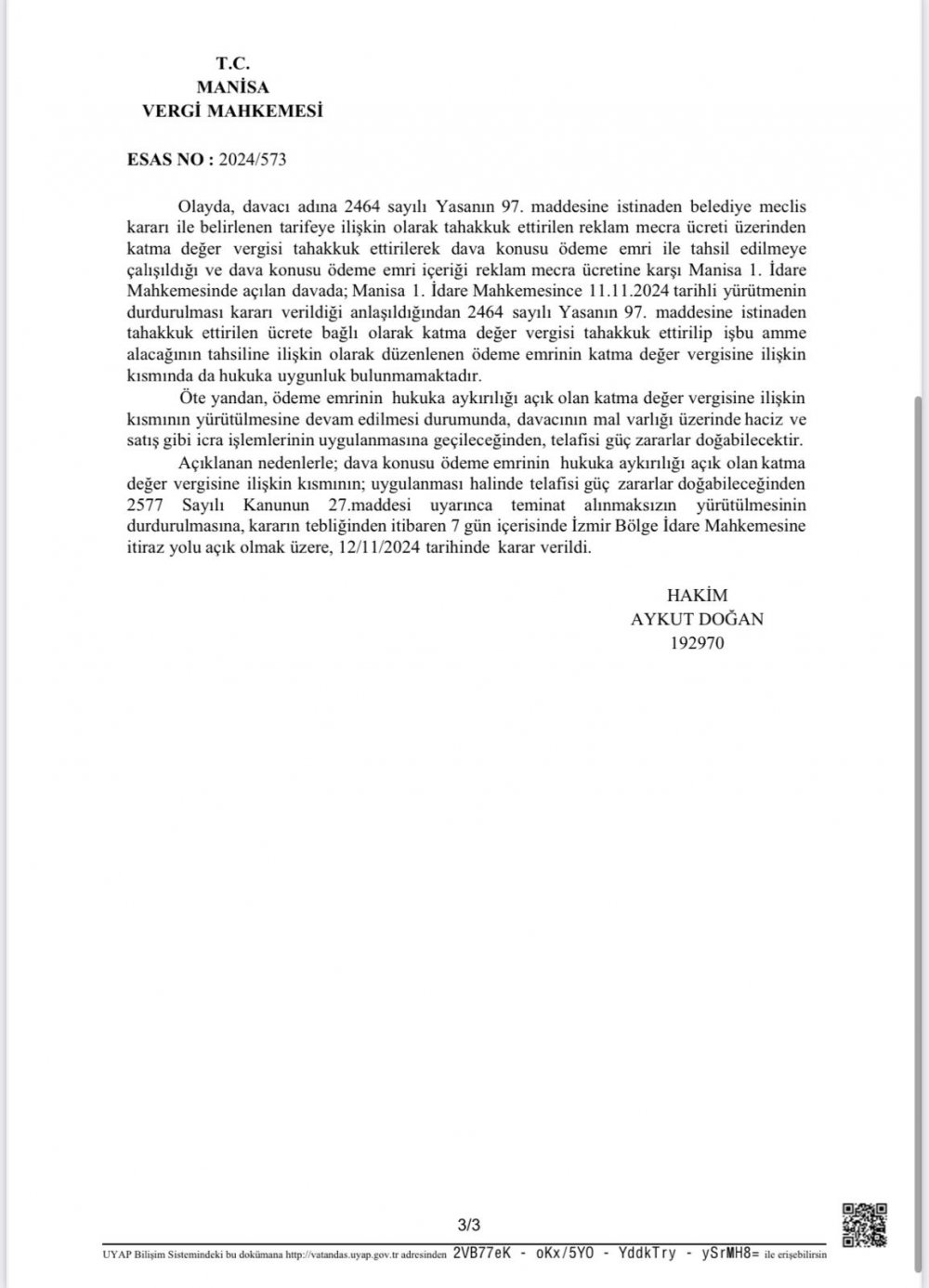 Gelinen noktada Manisa 1. İdare Mahkemesinin 07.11.2024 tarih ve 2024/815 E. Sayılı, Manisa Vergi Mahkemesinin 12.11.2024 Tarih ve 2024/573 E. Sayılı kararlarıyla müvekkil hakkında düzenlenen ödeme emrinin hukuka uygun olmadığı ve yürütülmesi durumunda telafisi güç yahut imkansız zararlar doğuracağından ötürü söz konusu ödeme emrinin Yürütmesinin Durdurulmasına karar verilmiştir.