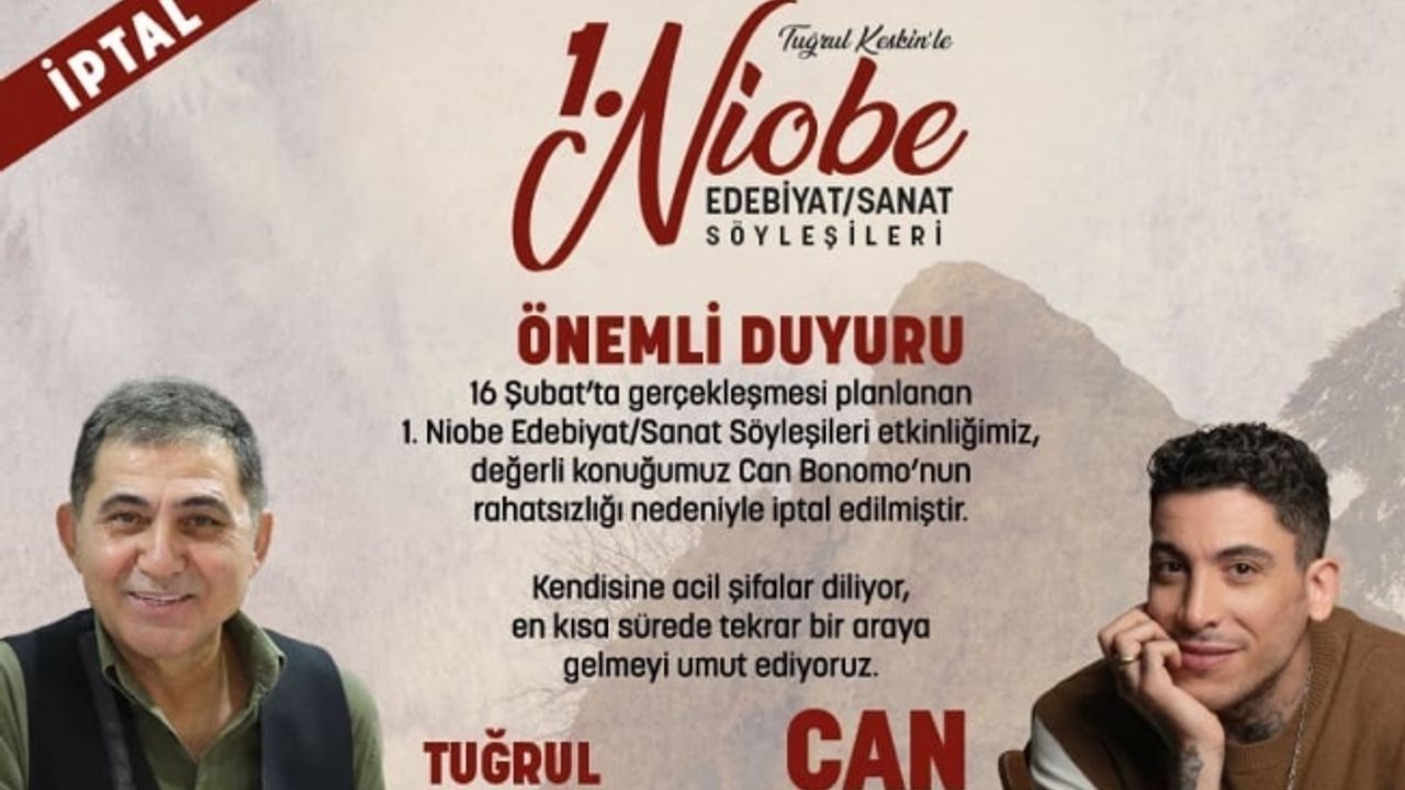 Manisa Büyükşehir Belediyesi’nin, Türk edebiyatının önemli şairlerinden Tuğrul Keskin ile müzisyen, şair ve yazar Can Bonomo’yu Manisalılarla buluşturmayı planladığı "1. Niobe Edebiyat Sanat Söyleşileri" programı, Bonomo’nun geçirdiği rahatsızlık nedeniyle iptal edildi. Can Bonomo, etkinlikte edebiyat serüvenini ve son romanını paylaşmayı planlıyordu. Moderatörlüğünü Tuğrul Keskin’in yapacağı söyleşide, Bonomo’nun eserlerinin ortaya çıkış süreci ve ilham kaynakları ele alınacaktı.