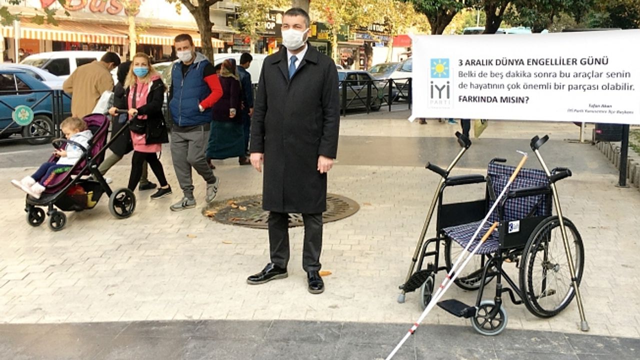 Sessiz eylemin ardından açıklamada bulunan İYİ Parti İlçe Başkanı Tufan Akan,” 3 Aralık Dünya Engelliler günü bu vesileyle bir farkındalık yapmak istedik. Çünkü her hangi bir sebepten dolayı özrü ve engelli bulunan Türkiye’de 8 milyon vatandaşımız var. Günlük yaşamda engelli vatandaşlarımızı göremiyoruz. Bunlarında çeşitli sebepleri var.En basiti yollardaki onların kullanımına açık olan o sarı şeritli alanların yeterli olmadığını biliyoruz, görüyoruz ve tespit ediyoruz. Biz diyoruz ki yerel belediyelerin ve merkezi hükümetlerin bu engelleri ortadan kaldırması lazım. Engelli vatandaşlarımıza engelsiz bir yaşam sunması lazım, bunun takipçisiyiz. Bugünde bu önemli günde bir farkındalık yaratmak adına böyle bir oluşumun içerisine girdik. Vatandaşlarımızın dikkatini çekmeye çalıştık” diye konuştu.