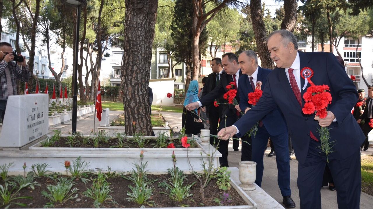 Manisa Vali Özkan ve beraberindeki protokol üyeleri şehitlerin kabirlerini ziyaret edip dua okuması ardından karanfil bıraktılar.