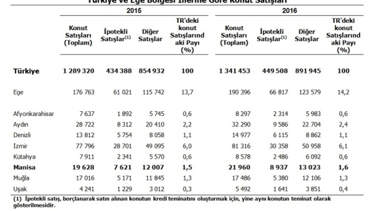 2015 yılında Ege Bölgesi’nde 176 bin 763 olan toplam konut satışı, 2016 yılında %7,7 artarak 190 bin 396 olarak gerçekleşmişti. Yine 2015 yılında 61 bin 21 olan ipotekli konut satışı, 2016 yılında %9,5 artarak 66 bin 817 olarak gerçekleşti. 2016 yılında ülkemizde yapılan toplam konut satışlarının %14,2’si, ipotekli konut satışlarının ise %14,9’u Ege Bölgesinde gerçekleşti.