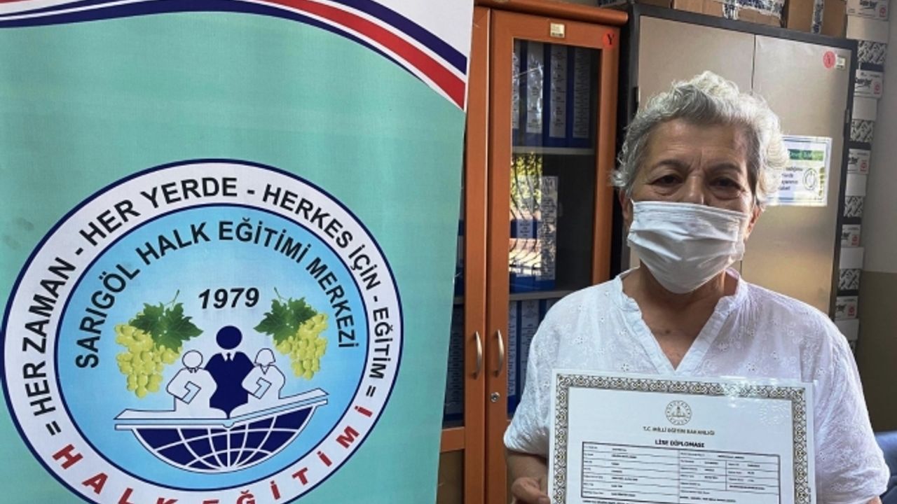 Manisa’nın Sarıgöl ilçesinde açık öğretim lisesini bitiren 71 yaşındaki Serpil Sözer, Sarıgöl Halk Eğitim Merkezi Müdürlüğünde düzenlenen törenle diplomasını Sarıgöl İlçe Milli Eğitim Müdür Vekili Cezmi Yıldırak’ın elinden aldı. 71 yaşında açık öğretim lisesi diplomasını 69.92 not ortalamasıyla almaya hak kazanan 3 çocuk ve 6 torun sahibi Sözer, "İlkokulu Denizli Saray 24 Mayıs İlkokulunda 1961 senesinde bitirdim. Ortaokulu annem ve babam, daha doğrusu babaannem engellediği için okuyamadım. 1964 yılında evlendim. 3 çocuğum oldu. 3’ünü de üniversitede okuttum. Torunlarım oldu, onlar da üniversiteyi bitirdi. 4. torunum üniversitede okurken bir buçuk sene önce kalp krizi geçirerek hayatını kaybetti. Mümkün olursa seneye torunumun ruhunu şad etmek için üniversite sınavına girmek istiyorum" dedi.
