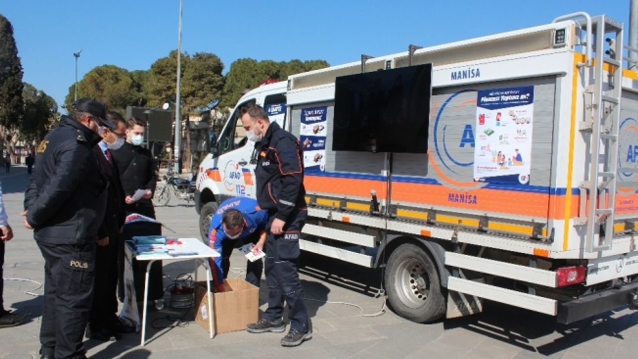 İçişleri Bakanlığının 2021 yılını Afet Eğitim Yılı ilan etmesinin ardından Manisa Valiliği İl Afet Acil Durum (AFAD) Müdürlüğü teorik eğitimlerin yanı sıra broşürlü tanıtım çalışmaları da yapıyor. Alaşehir Cumhuriyet ve Demokrasi Meydanı’nda kurulan stantta vatandaşlara broşür dağıtılarak ve ses sitemiyle bilgilendirme yapıldı. Tanıtım çalışmalarında deprem, yangın, sel gibi doğal afetlere karşı her an hazırlıklı olunması gerektiği, afetler karşısında afet ve acil durum çantası, beslenme ihtiyaçlarının karşılanabileceği gıdalar bulundurma, hijyenik maddeler bulundurma, kimlik bilgilerinin kişilerin yanında olması, ilk yardım çantası, radyo, el feneri, yedek pil, gibi zorunlu ihtiyaçların hazırlanması ve kullanılması gibi bilgilere sahip olunması anlatıldı. Vatandaşlara konuyla ilgili hazırlanan broşürler de dağıtıldı. Alaşehir Kaymakamı Abdullah Uçgun da çalışmaları yerinde izleyerek, bilgi aldı. Manisa AFAD Müdürlüğü uzmanı İbrahim İşlek, "AFAD ekipleri olarak, değişik toplantılar düzenleyerek teorik bilgilendirme çalışmaları yapıyoruz. Minibüse kurduğumuz ses sistemleri ile ilçelerimiz ziyaret ederek belirli yerlere stantlar açıyoruz. Burada vatandaşlara brüşür dağıtıyoruz, afet ve acil durumlar hakkında bilgilendirme, ses sistemiyle anlatım çalışmaları yapıyoruz." dedi.
