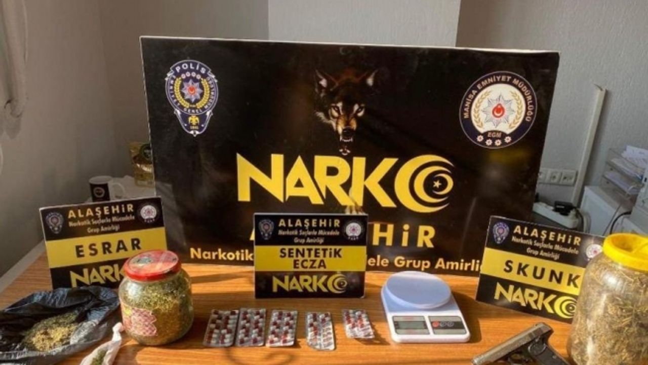Manisa İl Emniyet Müdürlüğü Alaşehir Narkotik Suçlarla Mücadele Grup Amirliği görevlilerince uyuşturucu veya uyarıcı madde ticareti yapan, nakleden ve kullanan şahıslara yönelik yapılan çalışmalarda Alaşehir ilçesinde bir ikamette yapılan aramada; 3 parça halinde 907,2 gram esrar maddesi, 470 gram skunk maddesi, 57 adet dentetik ecza hapı, 1 adet hassas terazi, 1 adet tüfek, 1 adet 7.65 mm tabanca, 9 adet 7.65 fişek ele geçirildi. Konuyla ilgili H. A. (20) isimli şüpheli şahıs ’Uyuşturucu veya uyarıcı madde imal ve ticareti yapmak’ suçundan gözaltına alındı. Emniyetteki işlemlerinin ardından şüpheli H.A., sevk edildiği adli makamlarca tutuklandı.