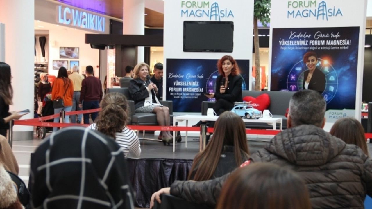 Manisa’nın en önemli çekim merkezlerinden biri olan Forum Magnesia Alışveriş Merkezi, 8 Mart Dünya Kadınlar Günü dolayısıyla düzenlediği etkinlikte, astroloji yorumcusu Belgin Koçak’ı astroloji meraklılarıyla buluştururken, güvenlik görevlileri de alışveriş merkezine gelen kadın müşterileri karanfil ile karşıladı.