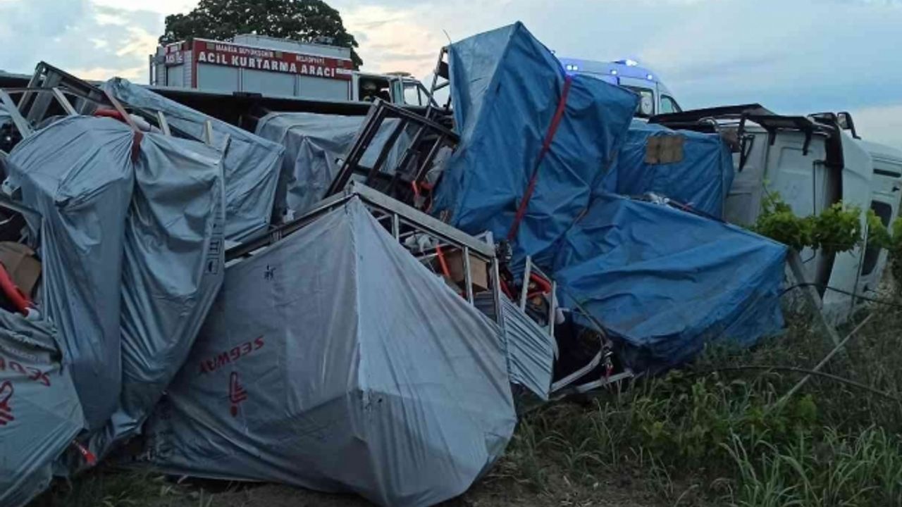 Manisa’nın Gölmarmara ilçesi Gölmarmara-Akhisar Devlet Karayolu Baştanlı Dondurma Tesisi Mevkiinde bugün saat 05.30 sıralarında 01 P 3309 plakalı dorse içinde 18 adet ATV motosiklet taşıyan K.B. (42) idaresindeki 41 AHL 647 plakalı tır, sürücüsünün direksiyon hakimiyetini kaybetmesi sonucu yolun sağında bulunan şarampole içindeki ATV motosikletlerle birlikte devrildi. Kazada tır sürücüsü K.B. (42) ve yanındaki oğlu M.B. (14) kazada yaralandı. Yaralıların Akhisar Mustafa Kirazoğlu Devlet Hastanesinde tedavi altına alınırken sağlık durumlarının iyi olduğu öğrenildi. Öte yandan kazada dorsede bulunan ATV motosikletlerin de zarar gördüğü tespit edildi.