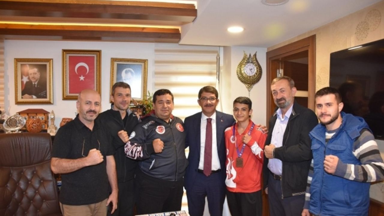 Şehzadeler Belediyesi Gençlik ve Spor Kulübü sporcusu Atakan Delikan, 65 ülkeden 850 sporcunun katıldığı Dünya Gençler Muaythai Şampiyonası’nda Milli Takım formasıyla Dünya üçüncüsü olarak başta ülkemiz olmak üzere Şehzadeler’e büyük sevinç yaşattı. Şampiyon sporcuyu, Şehzadeler Belediyesi Başkanı Ömer Faruk Çelik, makamında ağırlayarak altınla ödüllendirdi. Şampiyon sporcuya ziyareti sırasında Muaythai Federasyon Asbaşkanı Şakir Bayramoğlu, Muaythai İl Temsilcisi Mustafa Ören, Muaythai Antrenörü Yasin Çiftçi, Şehzadeler Belediye Spor Kulübü Antrenörü Kaan Levent, Ulusal Muaythai Hakemi Abdulvahit Alagöz ve Muaythai Ege Bölge Koordinatörü Ediz Barış da eşlik etti. Elde ettiği büyük başarı nedeniyle genç sporcuyu tebrik eden ve çeyrek altınla ödüllendiren Şehzadeler Belediye Başkanı Ömer Faruk Çelik, “Şehzadeler Belediyesi Gençlik ve Spor Kulübü Sporcumuz Atakan Delikan kardeşimizi elde ettiği büyük başarı nedeniyle tebrik ediyorum. Genç kardeşimiz bizlere, ülkemize büyük bir gurur yaşatmıştır. Sporcumuzun yetişmesinde emeği geçen Muaythai As Başkanı Şakir Bayramoğlu’na, Muaythai Manisa Temsilcimiz Ediz Barış’a Gençlik ve Spor İl Müdürümüz Yunus Öztürk’e, Şehzadeler Belediyesi Gençlik ve Spor Kulübü Yönetici ve hocalarımıza teşekkür ediyorum. Genç kardeşimize başarılarının devamını diliyorum” dedi.