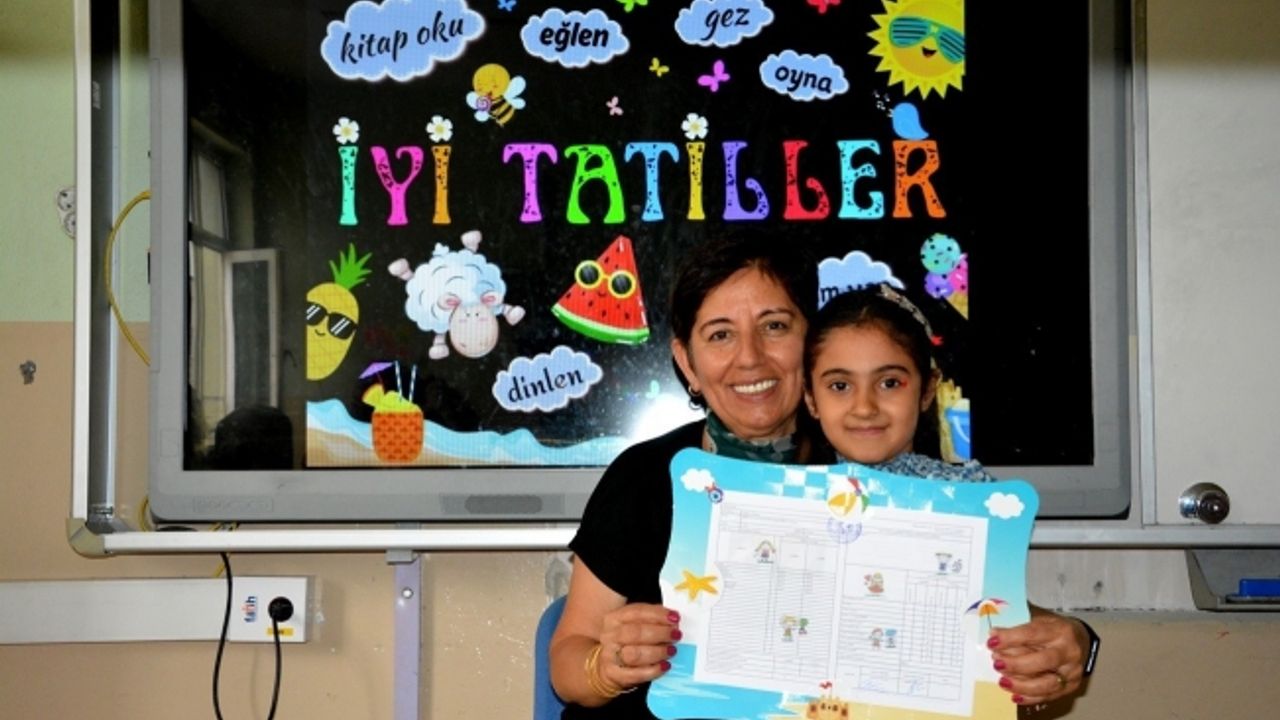 Manisa’nın Şehzadeler ilçesindeki Dr. Ömer Faruk Meriç Okulu öğrencileri de karnelerini alarak tatile başladı. 2023-2024 eğitim öğretim döneminin tamamlanması ile milyonlarca öğrenci karne alarak tatile çıktı. Şehzadeler ilçesinde bulunan Dr. Ömer Faruk Meriç İlkokulu 1/A sınıfı öğrencileri de birinci sınıfı bitirmenin mutluluğunu yaşadı. Öğretmenleri Semra Kaşıkçı öğrencilere karnelerini ve tatilde okumaları için kitap hediye ederken mutlu günleri fotoğraflarla ölümsüzleştirdiler.