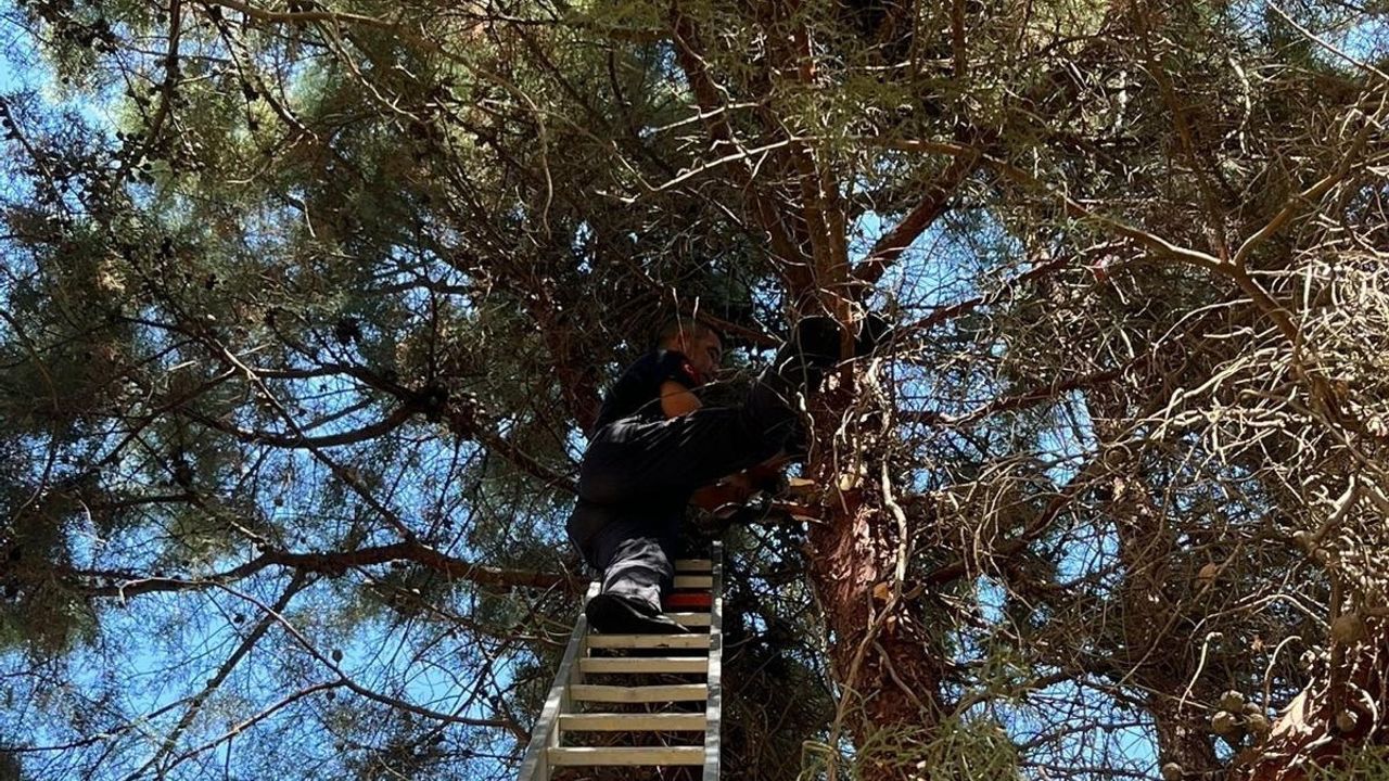 Manisa’nın Salihli ilçesinde çam ağacına tırmanıp mahsur kalan kedi, itfaiye ekiplerinin müdahalesiyle kurtarıldı.