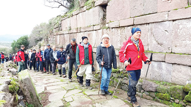 Dağcılar, Köseler Köyü’nden yürüyüşe başlayıp kentin en büyük tapınağı olan Apollon Tapınağı’na geldi. Spilos Dağcılık Başkanı Mehmet Güllüpunar, “Burada tapınak hakkında arkadaşlarımızı bilgilendirdikten sonra antik yoldan kentin nekropolüne, bundan 2200 yıl öncesine ait olduğu söylenen okul müdürünün lahitinin yanına geldik. Lahit hakkında etkinliğe katılanları bilgilendirdik. Antik kentin merkezinde bulunan çarşı binası, meclis salonu. Balıkpazarı, tiyatro, stadyum, cimnazyum, Roma hamamı, Atena tapınağını gezdik” dedi ve kentin tarihçesi ile ilgili şu bilgileri verdi: “Manisa’nın Köseler Köyü’nün iki km güneyinde Gün Dağı üzerinde çok önemli bir antik kent AİGAİ. MÖ 7. yüzyılda Yunanistan’dan gelip kuzeybatı Anadolu kıyılarına yerleşen Aiol’ler tarafından kurulan on iki kentten biri. Antik kentle ilgili ilk araştırma 1881 yılında Fransız S. Reinanc tarafından yapılmıştır. Kentle ilgili son dönem kazı çalışmaları 2004 yılından beri devam etmektedir. Ünlü tarihçi Heredot’a göre kentin adı AİGAİ’dir. Ayrıca Ege adının da Aigai, Aegaea, Ai- gaion’dan geldiği sanılmaktadır. Kazılarda bulunan sikkelerin üzerinde antik kentin simgesi karakeçi bulunmaktadır. Kentte yaşayan halk geçimini hayvancılık, tarım ve dokumacılıktan sağlamıştır. Burada üretilen işlenmiş keçi derilerinin, Magnesia ve Smyrna agoralarında satıldığı bilinmektedir. Kentin kuzeydoğusundaki agora L planında olup yüksek duvarlarla desteklenmiş, L’nin uzun kolu 82.30 m’lik uzun kolu doğuya, kısa kolu da kuzeye yöneliktir. Yapı üç katlı ve on bir metre yüksekliktedir.Alt kattaki dükkanlar dizisi iki bölümlü kare mekanlardan oluşmaktadır. Meclis binası, Çarşı binasının hemen yanında(kuzeydoğusunda)bulunmaktadır. Son yapılan kazılarda 150 kişilik meclis salonu tamamen gün yüzüne çıkarılmıştır. Kent yaşamı boyunca yağmur suyuna ihtiyaç duyulmuş, tüm cadde ve sokaklar taş döşenmiş yüzlerce sarnıca yönlendirilen kanalizasyon sistemi ile donatılmıştır. Aigai’nin tiyatrosu, mabetleri, gymnasiumu simetrik olarak kuzeybatıda sıralanmıştır. Helenistik Dö- neme ait tiyatronun MS 17’deki depremden sonra yenilendiği mimari süslemelerinden anlaşılmaktadır. Tiyatronun altındaki terasta gymnasiumu bulunmaktadır. MÖ 3. yüzyılda kurulan Bergama Krallığına Aigai’nin MÖ 218’de bağlanmasından sonra kentin kaderi değişmiş, Bergama Krallığının kurucusu Philetariuos’un büyük yardımlarıyla kent yeniden kurulmuş, en görkemli dönemini yaşamıştır. Akropol’ün yaklaşık üç km güneydoğusunda kentin en büyük tapınağı olan Apollon Khesterios Tapınağı bulunmaktadır. Kentin agorasından yaklaşık yaklaşık üç kilometreli antik bir yolla tapınağa ulaşılmaktadır. Bu yörede halk Apollon Tapınağına Dikilitaş demektedir.MÖ 48’de Prokonsül Servillius İsauricus’un Apollon Khesterios için yaptırmış olduğu bu tapınağın doğusu ayrı bir stoa ile çevrilmiş, kuzeyindeki propylaion’un uzun kenarında on iki, kısa kenarında altı sütun bulunmaktaymış. Ancak şu anda sütunlar çevreye yayılmış durumdadır. Aigai’nin diğer bir Aiol kenti olan Temnos ile birlikte Pers saldırılarına direndiği bağımsızlığını koruduğu bilinmektedir. MS 17’de bölgede meydana gelen büyük depremde yerle bir olan kent İmparator Tiberius’un yardımlarıyla yeniden imar edilmeye çalışılmıştır. Kentin adına son kez MS 5. yüzyıla ait psikoposluk listelerinde rastlanıyor.Kent MS 7. yüzyılda Arap saldırıları nedeniyle terk edilmiş kentteki iskan ise Demirkapı ardındaki sınırlı bir alanda devam etmiştir. Burada yaşayan halk 14. yüzyılın sonlarında Manisa ve çevresini ele geçiren Saruhanoğulları tarafından göçe zorlanmış ve kent terkedilmiştir. AİGAİ Antik Kenti sadece tarihe meraklıların değil, herkesin mutlaka gezmesi gereken bir antik kent. Eğer olanağınız varsa bölgeyi ve antik kentin tarihini iyi bilen bir rehber eşliğinde gezilmelidir. Bu etkinlikte bir arada olduğumuz Turgutlu Zirve Dağcılık yöneticilerine ve üyelerine, Spilos Dağcılık&Trekking yöneticilerine ve üyelerine doğaya, tarihsel miraslarımıza, kültür varlıklarımıza olan duyarlılıklarından dolayı teşekkür ederiz.” Spilos Dağcılık&Trekking 28 Ocak 2018 Pazar günü Gökçeler-Gürle Doğa yürüyüşünü gerçekleştirecek. Etkinliğe katılmak için 0 535 728 71 77 numaralı telefonu arayıp adınızı yazdırmalısınız. Etkinliğe tüm doğaseverler davetli. www.spilostrekking.com
