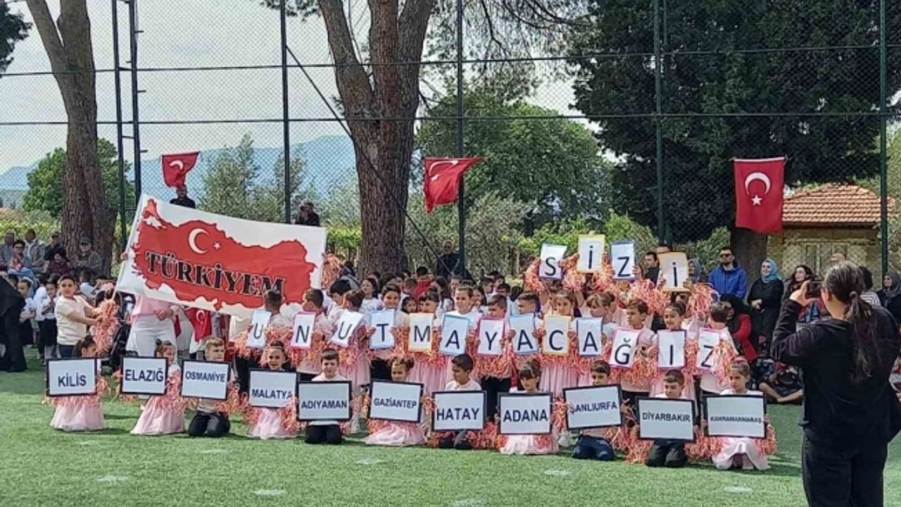 Manisa’nın Sarıgöl ilçesinde ilkokul öğrencilerinin, depremin vurduğu iller için hazırladığı etkinlik izleyenleri duygulandırdı.