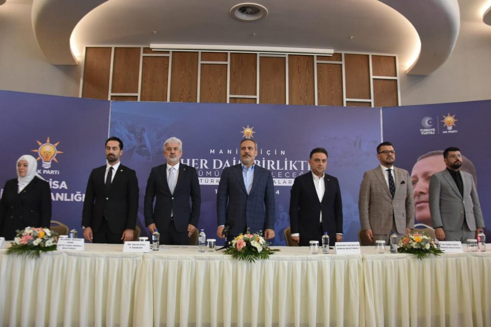 Valilik ziyaretinin ardından Bakan Fidan ikinci programı için Yunusemre ilçesindeki bir otelde AK Parti teşkilatıyla buluştu. ‘Her daim birlikte, özümüzden geleceğe Türkiye buluşmaları’ kapsamında yapılan toplantıya Bakan Fidan’ın yanı sıra AK Parti MKYK Üyesi ve Manisa Milletvekili Mücahit Arınç, AK Parti Manisa milletvekilleri Murat Baybatur, Tamer Akkal, AK Parti Manisa İl Başkanı Salih Hızlı, AK Parti Manisa İl Gençlik Kolları Başkanı Ömer Can Temizel, AK Parti Manisa İl Kadın Kolları Başkanı Ebru Kaplan, ilçe başkanları, kadın kolları ve gençlik kolları üyeleriyle birlikte partililer katıldı.