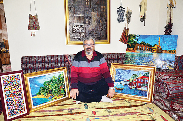 Renkli camları tek tek kesen Karakaş, eserlerinde yaklaşık 50 bin cam parçası kullanıyor. Cam mozaik sanatını herkese öğretmeyi isteyen Karakaş, sabır isteyen cam mozaik sanatını askerlikte aldığı disiplinle sürdürüyor. Manisa’da yaşayan 56 yaşındaki Ali Fuat Karakaş, 30 yıl askerlik mesleğini sürdürdükten sonra emekli oldu. Askerlik yıllarında sanatla ilgilenen Karakaş, cam mozaik sanatına merak saldı. Araştırmaları sonucunda kendi çabasıyla cam mozaik yapmayı öğrenen Karakaş, sanatını ilerletti. 1 yıl içinde birçok içinde binlerce cam parçasının yer aldığı tabloları yapan Karakaş, evini de adeta sanat müzesine çevirdi. Mesleğinden albay rütbesiyle emekli olduğunu anlatan Karakaş, merhum Cumhurbaşkanı Süleyman Demirel ve eski Cumhurbaşkanı Ahmet Necdet Sezer’in 7 yıl yakın korumalığını yaptığını söyledi. Askerlik yıllarında da karakalem üzerine çalıştığını aktaran Ali Fuat Karakaş, “ Kendimi terapi etmek için cam mozaik sanatına başladım. Küçük küçük cam parçalarını bir araya getiriyorum. Camı kendim alıyorum, kestiğim camı küçük küçük parçalar içinde resme yerleştiriyorum. Zor bir sanattır. Eliniz kesiliyor, batıyor. Bir resmin bitmesi yaklaşık 3 ay sürüyor” diye konuştu. Disiplinli olmayan bir kişinin bu sanatı yapamayacağını dile getiren Karakaş, “Askerlik mesleği zorluğa alışmak mesleğidir, üşümezsiniz, acıkmazsınız. Sabır ister. Bu sanatta da sabır ve katlanmak çok önemlidir. 1 saatte küçücük yeri yaparsınız. Bir tabloda yaklaşık 50 bin cam parçası kullanıyorum” dedi. BU SANATI ÖĞRETMEK İSTİYOR Yaşlı olan kişilerin sanata yönelmesini istediğini anlatan Karakaş, “Kahvede oturmaktansa sanatla uğraşmak en güzeli. Yaptığım eserlerle kişisel bir sergi açmak istiyorum. Eğer imkan olursa da bu sanatı gençlere, ev kadınlarına ve emeklilere öğretmeyi istiyorum” diye konuştu.