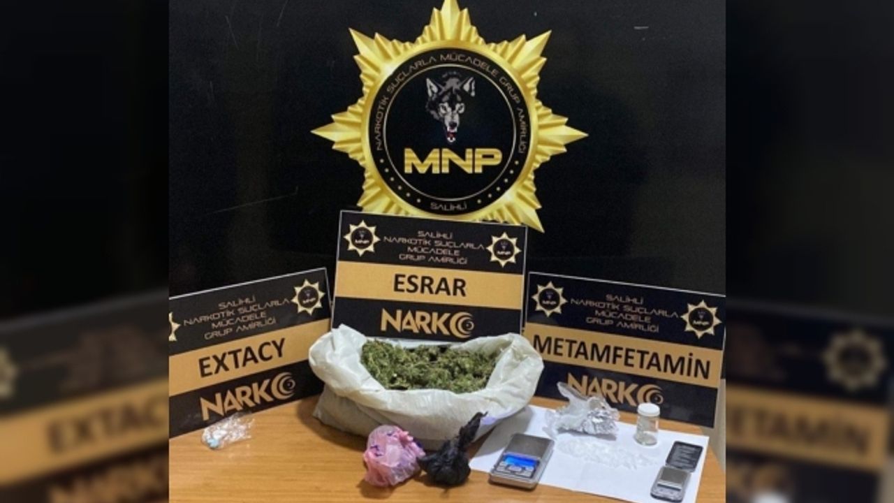 Manisa İl Emniyet Müdürlüğü Salihli Narkotik Suçlarla Mücadele Grup Amirliği görevlilerince uyuşturucu veya uyarıcı madde ticareti yapan, nakleden ve kullanan şahıslara yönelik yapılan çalışmalarda Salihli ilçesinde durdurulan şahısların üzerinde yapılan aramada, 3 parça halinde 412,62 gram esrar maddesi, 2 parça halinde 15,78 gram metamfetamin maddesi, 5 adet Ecstasy hap, 2 adet hassas terazi ele geçirildi. Konuyla ilgili 2 şüpheli şahıs yakalanırken, şüphelilerden U.E. (31), ’Uyuşturucu veya uyarıcı madde imal ve ticareti yapmak’ suçundan gözaltına alınarak sevk edildiği adli makamlarca tutuklandı.