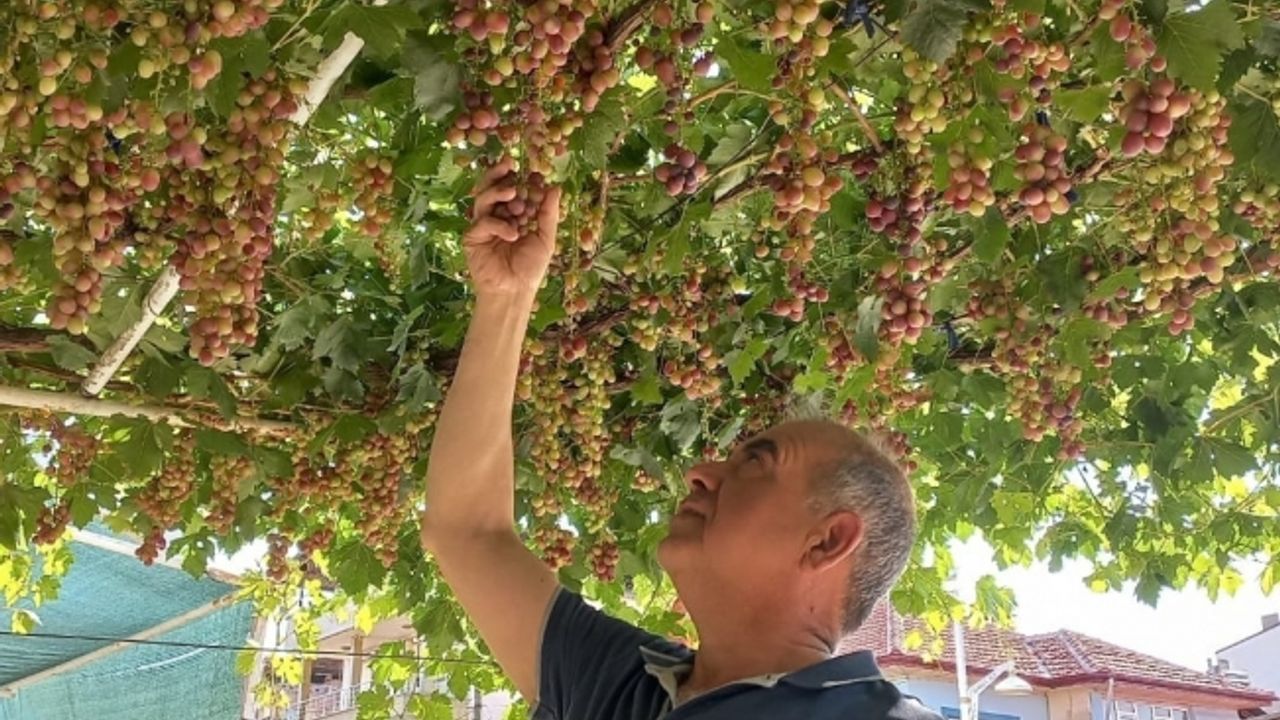 Sarıgöl ilçesi Konak Mahallesi Dr. İhsan Avcı Caddesi’nde ikamet eden Bekir Yılmaz (63), yıllardır evinin önünde yetiştirdiği "Uslu" cinsi üzümden erken hasat yaparak konu komşusuyla birlikte tüketiyor.