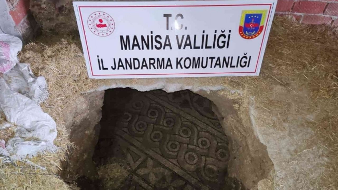 Manisa’nın Saruhanlı ilçesine bağlı Sarıçam Mahallesi’nde bir evde kaçak kazı yapıldığı ve ev içerisinde bir çok tarihi eser olduğu istihbaratı üzerine Kaçakçılık ve Organize Suçlarla Mücadele Şube Müdürlüğü, İstihbarat Şube Müdürlüğü ve Saruhanlı İlçe Jandarma Komutanlığı ekipleri harekete geçti. H.Ö. (62) ve M.Ö. (70) isimli şahısların yaşadığı evde yapılan aramalarda evin tabanının kazıldığı ve evden Roma dönemine ait taban mozaiği bulunduğu tespit edildi. Öte yandan evde yaşayan 2 şüphelinin buldukları taban mozaiğini çevrelerine pazarlayarak satmaya çalıştığı öğrenildi.