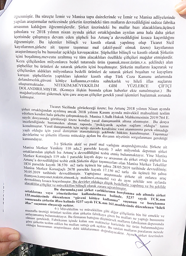 Üretici Ruhi Bozalan’ın yaptığı suç duyurusu dilekçesinde de, İşadamı İsa Artunç ile ilgili gündeme getirdiği iddialar dikkat çekti. Ruhi Bozalan’ın vekil avukatı Tayfun Erdaş aracılığıyla suç duyurusu dilekçesinde, “2018 yılı Kasım ayında ödeme yapılmamış olmasına rağmen dönem sonu olduğu için müvekkilime ödeme yapıldığını gösteren müstahsil makbuzlarını vermiştir. Müvekkilim de her sene ödemesini aldığı için ve firmanın güvenilir olduğuna inandığı için en ufak bir art niyet gütmeden faturalı teslim almış ve birer örneğini prim desteğini alabilmek için ilçe tarım müdürlüğüne teslim etmiştir. 2019 Mart’ta alacağını isteyen müvekkilime ödemesi yapılmadığı gibi şüpheliler müvekkilimi her defasında oyalamıştır. Müvekkilime aylarca ‘şu tarihte yatıracağız’ denerek kandırılmıştır. Müvekkilim bir süre sonra şirkette kendisine muhattap bulamamış ve hatta telefonları dahi cevaplanmamıştır. Bu sürede müvekkilim kendisi gibi 140 çiftçi daha olduğunu öğrenmiştir. İzmir ve Manisa tapu daireleri ile adliyede yapılan araştırmalar neticesinde şirketin tüm mallarının devredildiği, sadece fabrika arsasının kaldığı öğrenilmiştir. Şirket üzerindeki bu mallar bazı alacaklılara, 3. Şahıslara ve 2018 Nisan’da şirket ortaklığından ayrılan ama hala daha şirket içinde çalışmaya devam eden şüpheli İsa Artunç’a devredildiğini; kısaca kaçırıldığını öğrenmiştir. Bu işlemler bilinçli ve kasıtlı yapılmış olup kayıtların araştırmasıyla bu hususlar açıklığa kavuşacaktır. 2018 Nisan’da şirketten ayrıldığını beyan eden İsa Artunç, 2018 Kasım’da müvekkilim mahsülünü teslim ederken şirkette çalışmaktaydı. Kendisi (İsa Artunç) yasal danışmanlık altına alınmıştır. Hastaneden alınan raporda, ‘psikiyatrik açıdan sağlam’ olduğu tanısı konulmuştur. Yasal danışmanlık için açtığı davadan kendisine vasi atanmasına gerek olmadığı, yaşlı olduğu için yasal danışman atanabileceği şeklinde hüküm kurulmuştur. Taşınmaz devirlerine ve şirketin iflasına müteakip açılan bu davanın niyeti sorgulanmalıdır. Şirketin aktif ve pasif mal varlığını araştırdığımızda şirkete ait Manisa Merkez Yeniköy 110 ada 2 parselde kayıtlı 3 adet milyonluk deponun şirket ortaklarından şüpheli İsa Artunç’a devredildiğini tespit ettik. Karaağaçlı 119 ada 1 parselde kayıtlı depo ve arsanın da şirket ortağı şüpheli İsa Artunç’a devredildiğini tespit ettik. Bu devirler oldukça düşük bedellerle yapılmış ve bu şekilde alacaklılar, çiftçiler ve müvekkilim bilinçli olarak zarara uğratılmıştır. Şirket varlıklarının borçlanma adı altında şirket ortaklarına veya yöneticilerine kullandırılması halinde ‘güveni kötüye kullanma’ ve borçlanma sonucunda şirketin iflası halinde ‘hileli iflas’ suçunun oluşacağı açıktır” ifadelerine yer verildi.