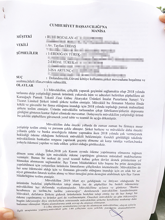 Manisa’da üzüm, pamuk, mısır gibi ürünler yetiştiren çiftçiler, Karaağaçlı Mahallesi’nde faaliyet gösteren tarım işletmesine teslim ettiklerini ürünlerin parasını alamadıklarını öne sürdü. Yaklaşık 140 üreticinin mağdur olduğunu savunan çiftçiler, Manisa Adliyesi önüne gelerek önce basın açıklaması yaptı, ardından Erdoğan Türek, Erdal Türek ve İsa Artunç hakkında dolandırıcılık, güveni kötüye kullanma, şirket mevcudunu boşaltma ve azaltma, hileli iflas ve evrakta sahtecilik iddiasıyla suç duyurusunda bulundu. Çiftçilere, CHP Grup Başkanvekili ve Manisa Milletvekili Özgür Özel, Manisa Barosu Başkanı Ali Arslan ve CHP Manisa İl Başkanı Semih Balaban da destek verdi.