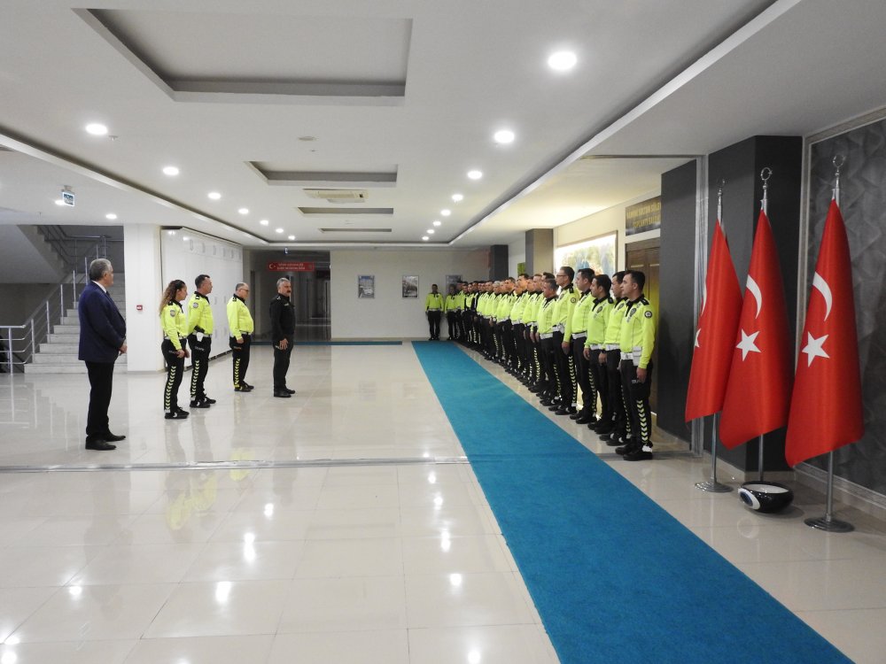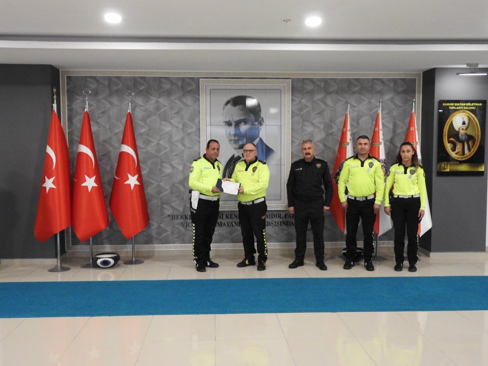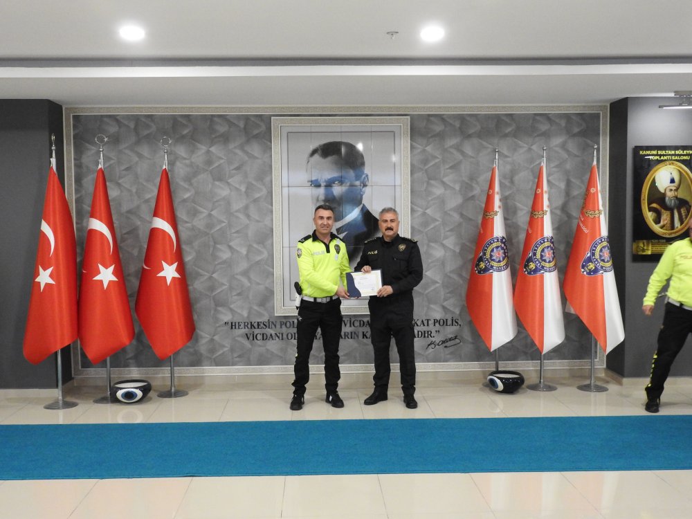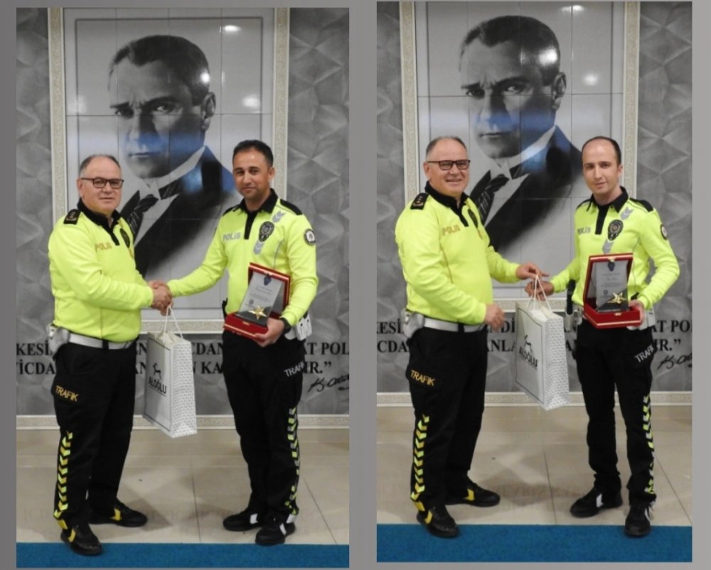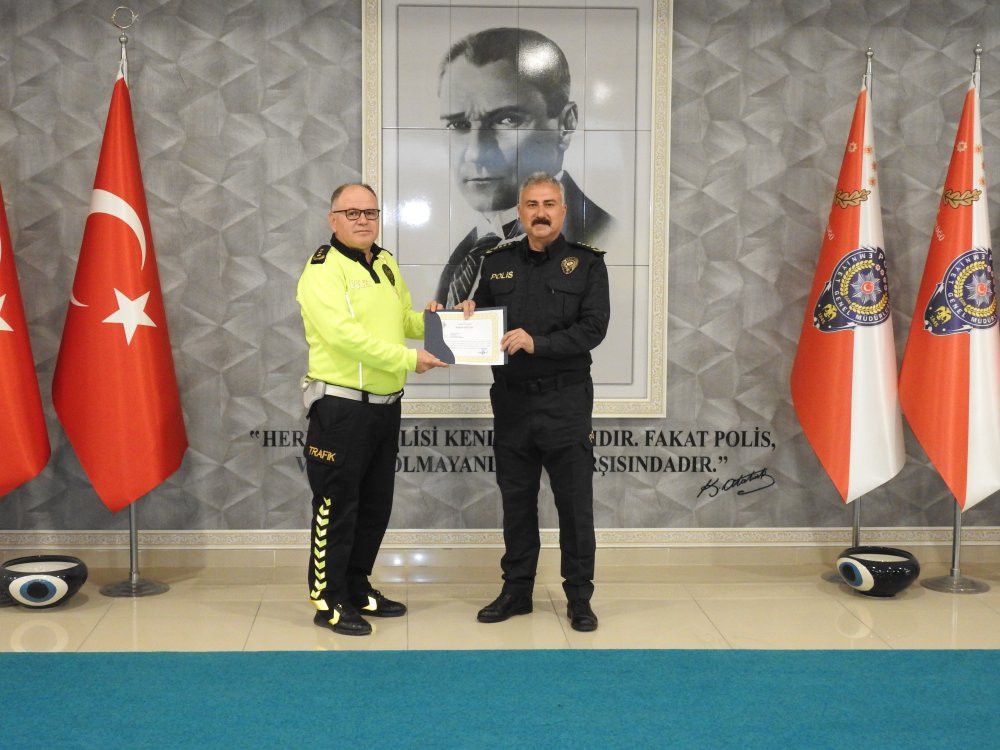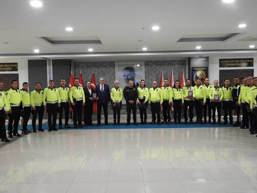 Yılın en başarılı Trafik polisleri Muhammet İnce ve Enes Genç'e plaketleri ile diğer başarılı polislere başarı belgeleri düzenlenen törenle Emniyet Müdürü Fahri Aktaş ve Müdür Yardımcıları tarafından takdim edildi.