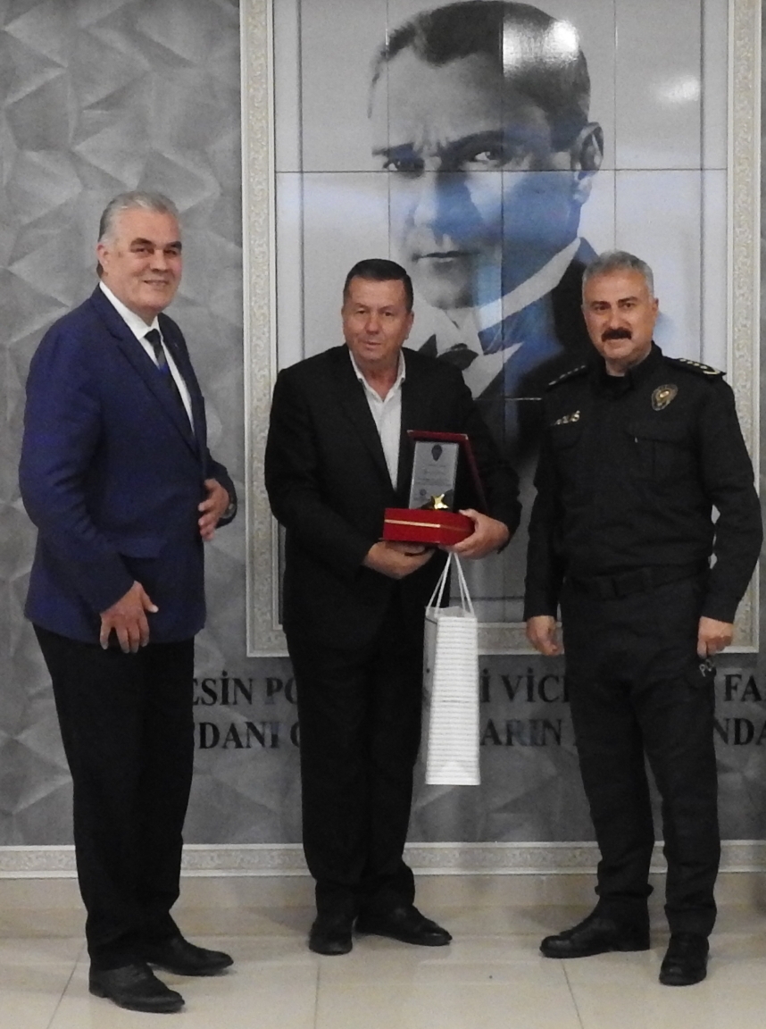 Ödül töreni sonunda, trafik haftasını kutlama kapsamında emniyet personeli adına Trafikten Sorumlu Emniyet Müdür Yardımcısı İlker Çetinkaya, Il Emniyet Müdürü Fahri Aktaş'a hediye takdim etti.(Turgay Duyar)