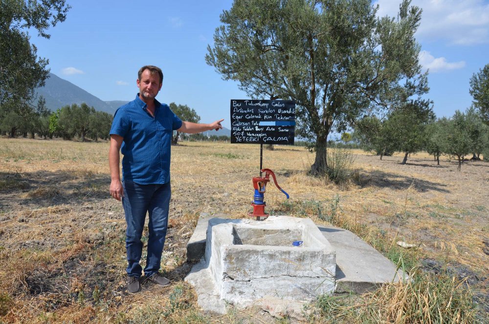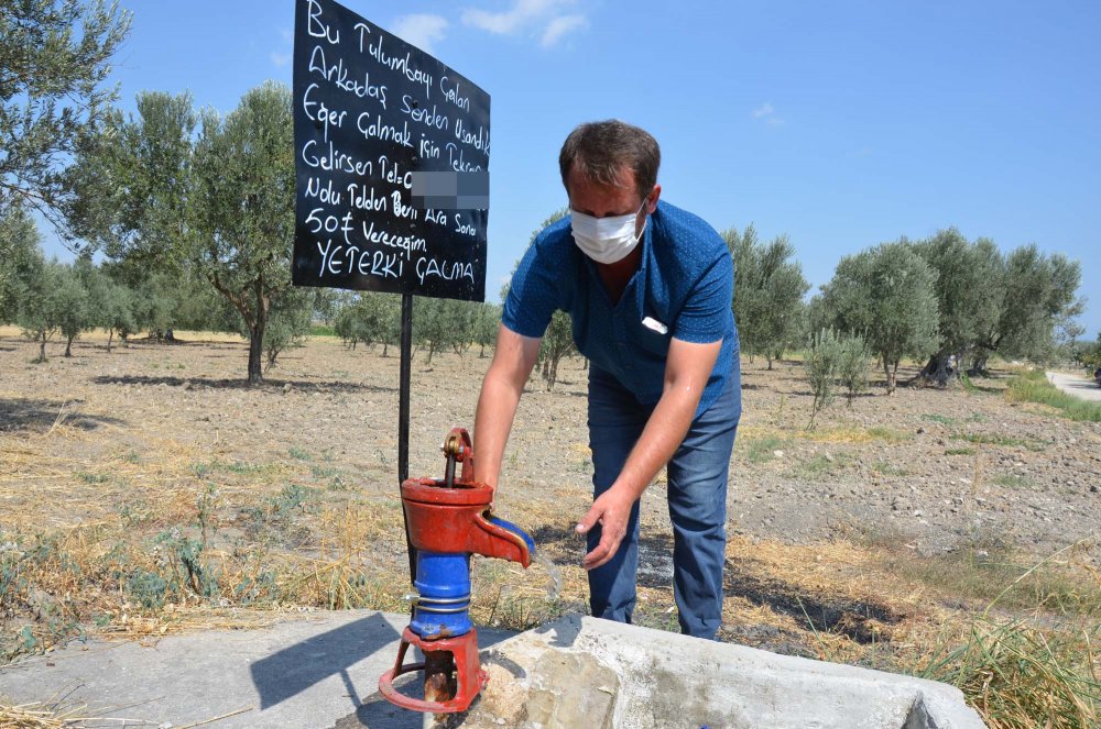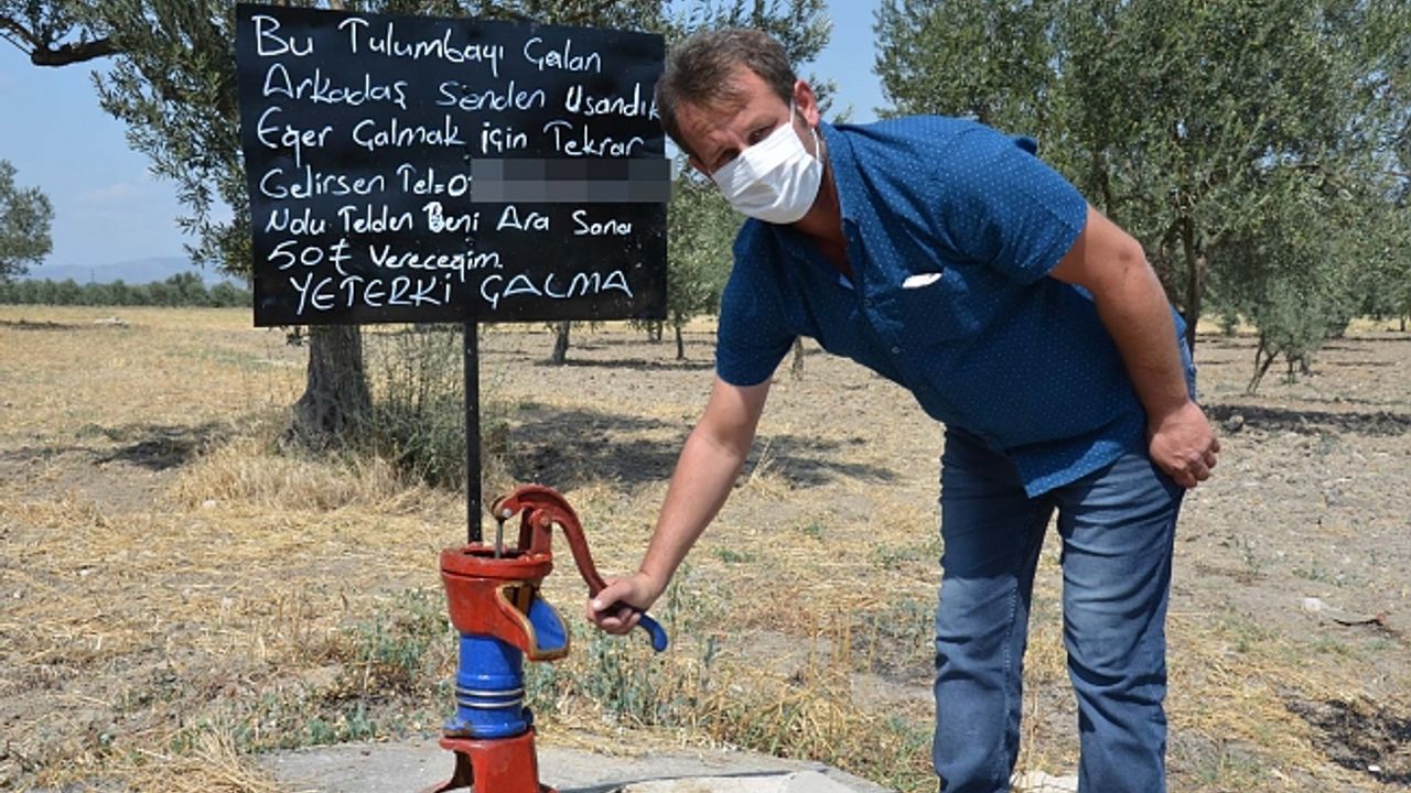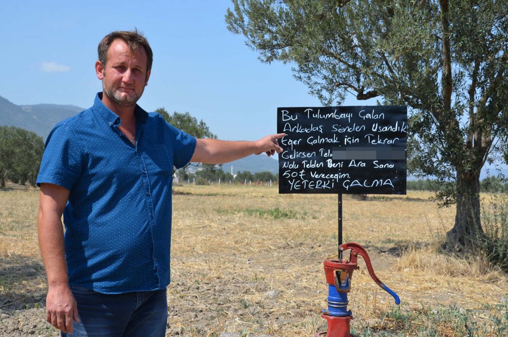 Manisa’nın Kırkağaç ilçesi Bakır Mahallesi’nde hayvanlar ve insanlar için su çeşmeleri yaptıran İslam Yaşar’ın başı hırsızlarla dertte. İslam Yaşar, yaşadığı mahalle yakınlarında tarla kenarına yapılan su tulumbasının en az 15-20 kez çalınmasından bıktı. Tepkisini de ilginç bir şekilde gösterdi. İslam Yaşar tulumbanın üstüne tabela yazdırıp astı ve hırsızlara seslendi. Hayırsever vatandaş, tabelada hırsızlardan usandığını ve su tulumbasını çalmamaları karşılığında kendisi aramaları halinde 50 TL vereceğini söyledi.