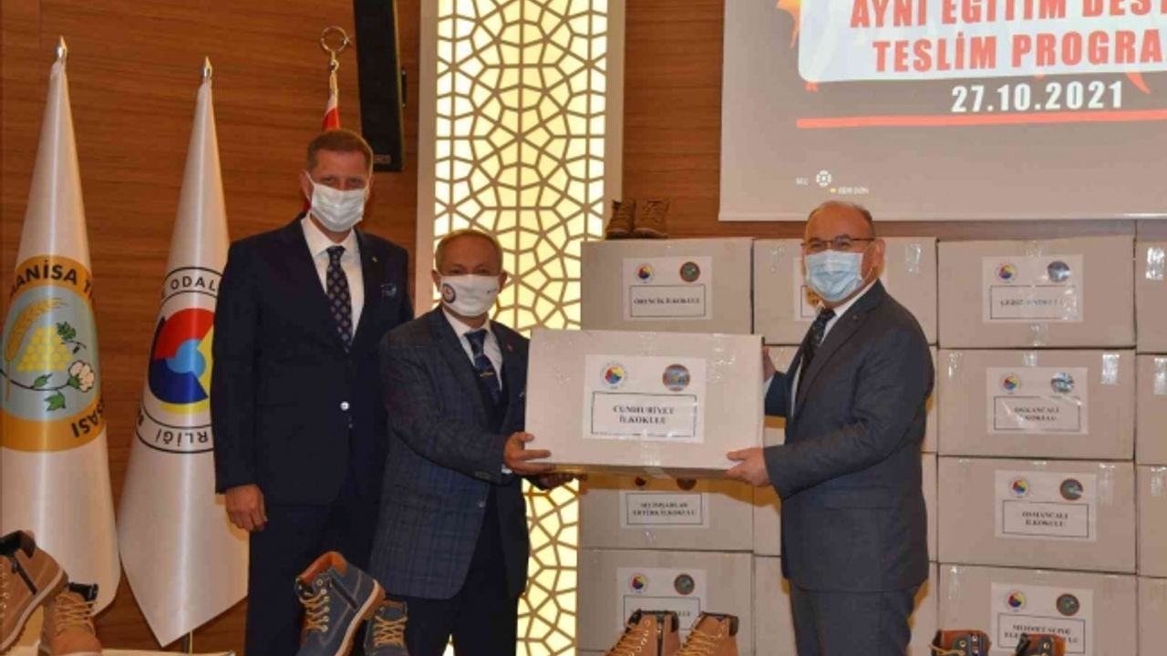 Türkiye Odalar ve Borsalar Birliği ile Manisa Ticaret Borsası tarafından ihtiyaç sahibi öğrencilere ulaştırılmak üzere 1.350 adet bot temsilen Şehzadeler, Yunusemre ve Saruhanlı ilçelerinde görev yapan okul müdürlerine teslim edildi.