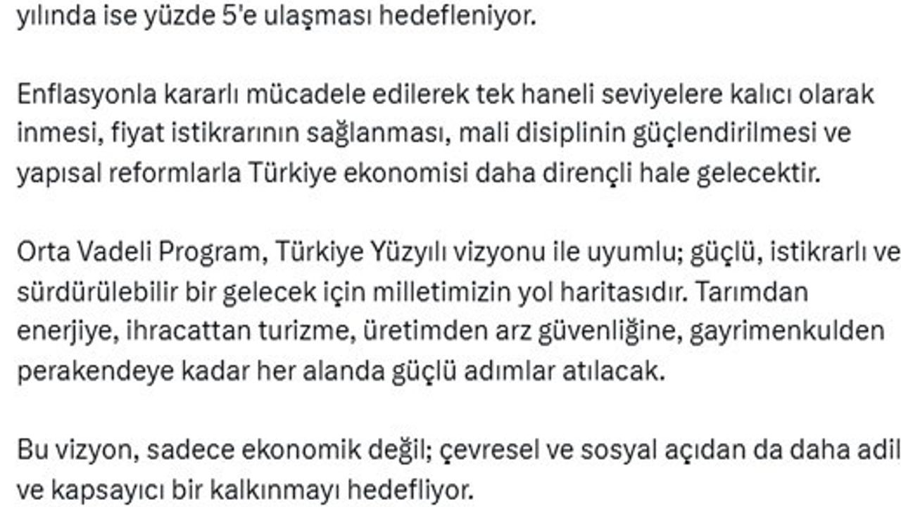 Cumhurbaşkanlığı İletişim Başkanı Burhanettin Duran, "Orta Vadeli Program, Türkiye Yüzyılı vizyonu ile uyumlu; güçlü, istikrarlı ve sürdürülebilir bir gelecek için milletimizin yol haritasıdır. Tarımdan enerjiye, ihracattan turizme, üretimden arz güvenliğine, gayrimenkulden perakendeye kadar her alanda güçlü adımlar atılacak" dedi.