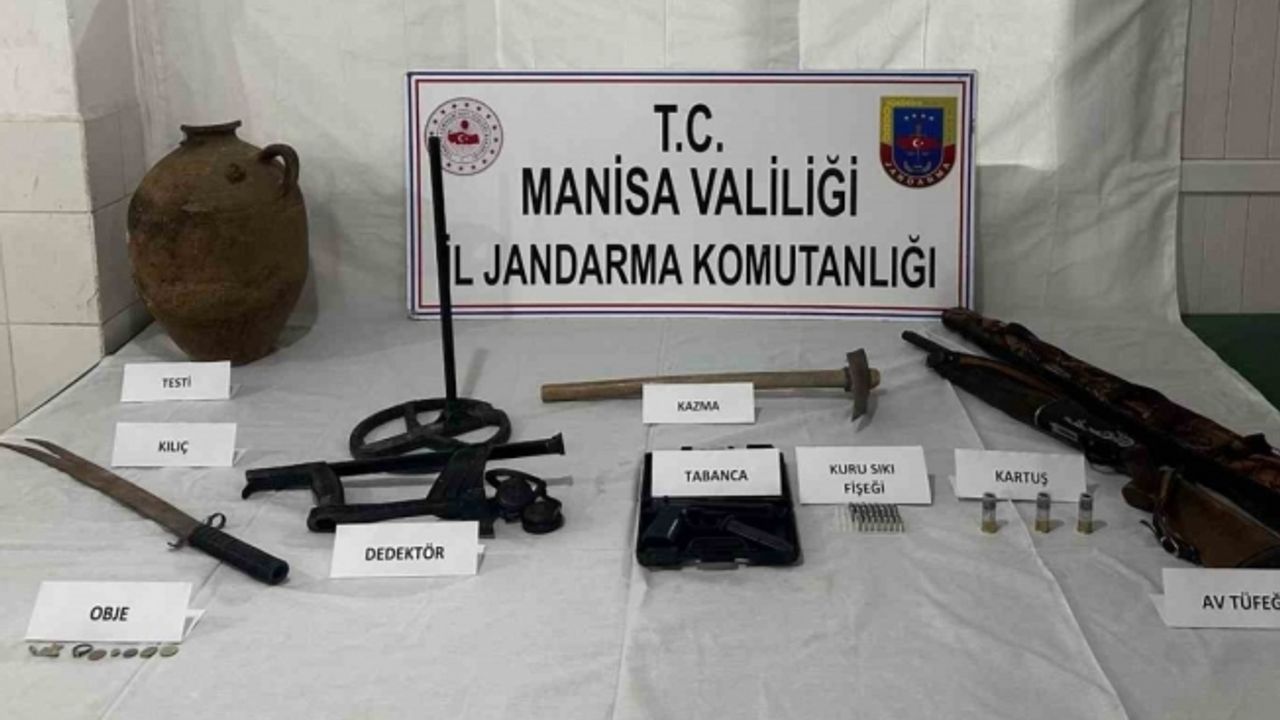 Manisa’nın Demiri ilçesinde Sidas Antik Kentinde kaçak kazı yaptığı belirlenen şahsa yönelik yapılan değerlendirmede çok sayıda tarihi eser olduğu değerlendirilen obje ile ruhsatsız silah ele geçirildi.