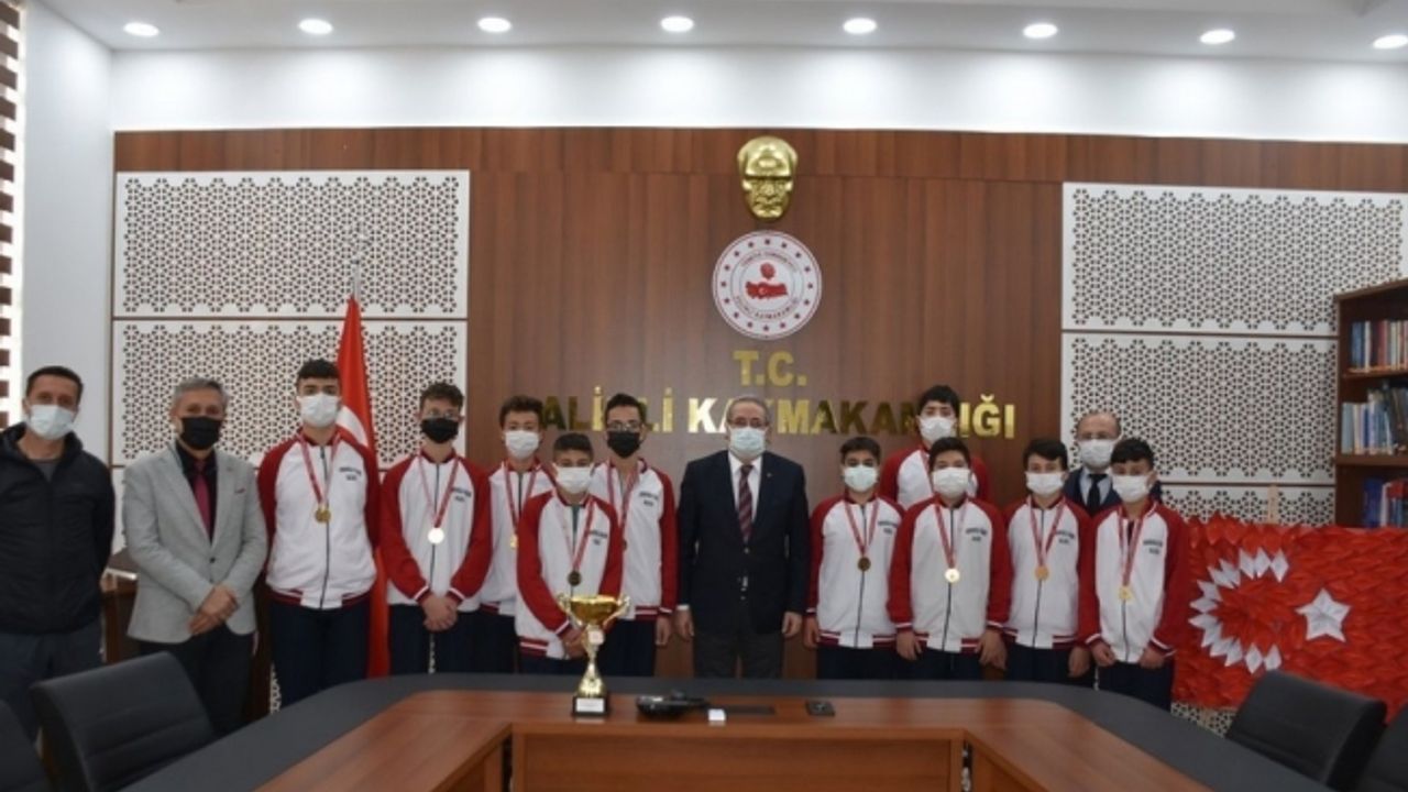 Bilecik’te düzenlenen finallerde bölge şampiyonu olan Manisa’nın Salihli ilçesi 50. Yıl Ortaokulu Yıldız Erkekler Hentbol Takımı sporcuları Salihli Kaymakamı Mehmet Kamil Sağlam’ı ziyaret etti.