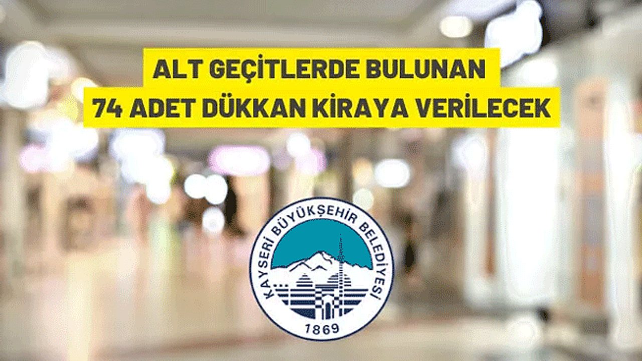 Kayseri Büyükşehir Belediyesi mülkiyetinde bulunan Hunat alt geçidinde 12, Düven önü alt geçidinde 12, Orduevi önü alt geçidinde 12, Kocasinan alt geçidinde 18, Melikgazi alt geçidinde 20 adet olmak üzere toplam 74 adet dükkan, 2886 sayılı Devlet İhale Kanunu'nun 37. maddesine göre “Kapalı Teklif Usulü İhale” ile toplu olarak 10 yıllığına kiraya verilecek.