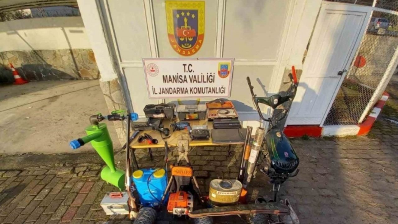 Manisa’nın Kırkağaç ilçesinde ocak ayı içerisinde meydana gelen hırsızlık olaylarının aydınlatılması amacıyla 2 Şubat günü saat 07.30 sıralarında Kırkağaç ilçe Jandarma Komutanlığı ekipleri ve İl Jandarma Komutanlığı JASAT timince yapılan istihbarı çalışma sonucu İzmir’in Kınık ve Bergama ilçelerinde ikamet ettikleri tespit edilen E.A. E.T. H.B. T.A. ve A.E. isimli şahısların ikametgahlarında ve eklentilerinde adli makamlardan alınan arama kararına istinaden yapılan arama, 2 adet av tüfeği, 1 adet çapa motoru, 2 adet çapa aparatı, 2 adet zeytin silkme makinası, 1 adet güneş paneli, 2 adet sırt tipi ilaçlama pompası, 1 adet dalgıç pompa, 1 adet sırt tipi ilaçlama motoru, 1 adet amfi ve muhtelif malzemeler ele geçirildi.