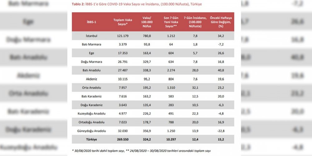 Rapora göre 24-30 Ağustos 2020 tarihleri arasında en yüksek yeni vaka sayısı Batı Anadolu’da görüldü. En az vakanın ise 64 kişi ile Batı Marmara’da görüldüğü bilgisi yer alıyor.