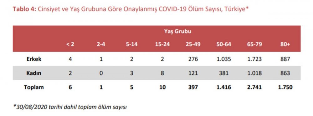 Haftalık durum raporunda yer alan bilgilere göre, Sağlık Bakanlığı tarafından onaylanmış Türkiye’de toplam 6 bin 326 kişinin COVID-19 nedeniyle hayatını kaybettiği bilgisi yer alıyor. Onaylanmış vakaların içindeki ölüm hızının yüzde 2,35 olduğu belirtiliyor. Raporda en düşük ölüm hızının yüzde 0,03 ile 2-4 ve 15-24 yaş grubunda gerçekleştiği, en yüksek ölüm hızının ise yüzde 25,77 ile 80 yaş ve üzeri gruba ait olduğu belirtildi.
