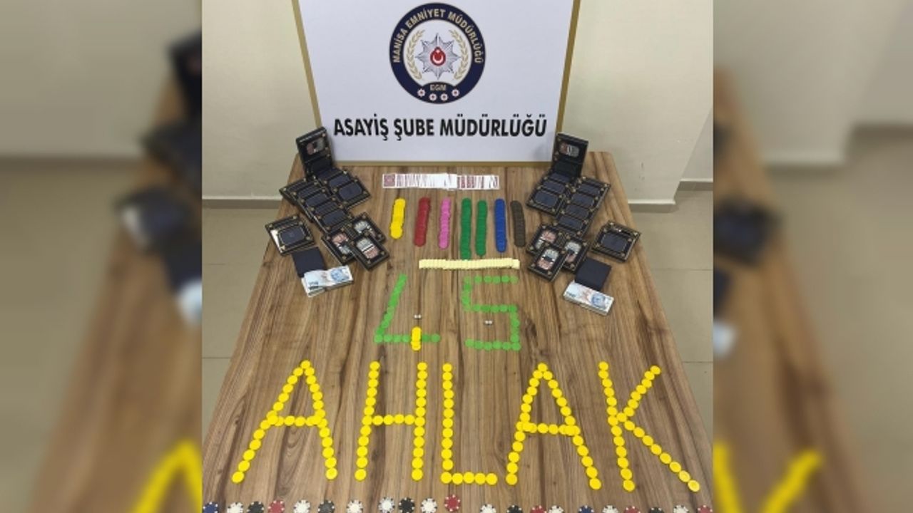 Manisa İl Emniyet Müdürlüğü Asayiş Şube Müdürlüğü Ahlak Büro Amirliği görevlilerince yapılan çalışmalarda Şehzadeler ilçesinde bir ikamette kumar oynandığı tespit edilmesi üzerine gece yarısı 00.30 sıralarında söz konusu adreste yapılan aramada, 70 deste iskambil kağıdı, 26 adet okey taşı, 404 adet pul, 4 adet zar, 400 TL para, 3 adet hesap defteri, 2 adet uyuşturucu hap ele geçirildi. Konuyla ilgili kumar oynadığı tespit edilen 6 şahsa Kabahatler Kanununun 34. maddesine göre 24 bin 330 TL idari para cezası uygulanırken, ev sahibi V. A. (30) isimli şahıs hakkında ’Kumar oynanması için yer ve imkan sağlama’ ve TCK 191 ’Kullanmak için uyuşturucu madde bulundurmak’ suçlarından adli işlemlere başlandığı bildirildi.