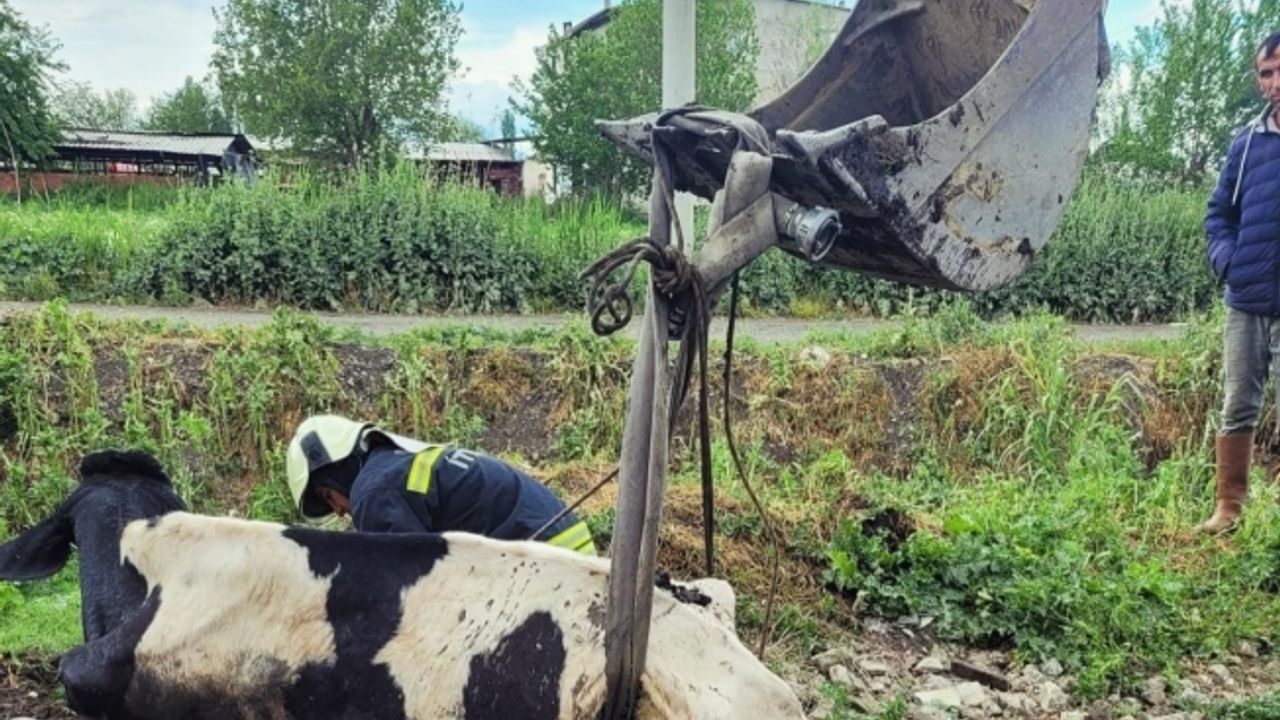 Manisa’nın Salihli ilçesinde kurutma kanalına düşen inek itfaiye ekiplerinin uzun süren çabaları sonucu kurtarıldı.