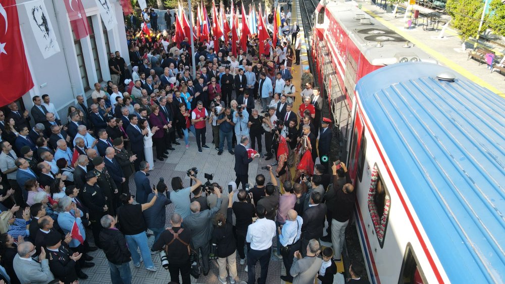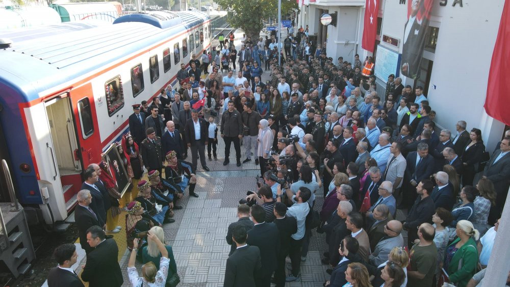 Manisa Tren Garına gelen trenden ilk olarak, yöresel kıyafet giymiş öğrenciler tarafından taşınan Atatürk portresi indirilirken, ardından Türk bayrağı getirildi. Getirilen Türk bayrağı, öğrenciler tarafından Manisa Valisi Vahdettin Özkan’a takdim edildi.