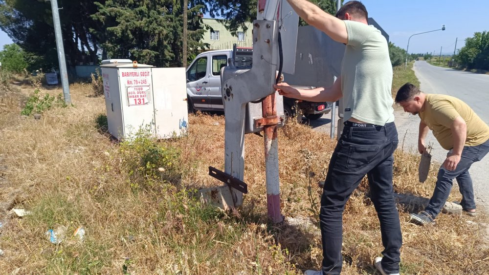 Yaklaşık 40 dakika sonra gelen DDY Arıza ekibi, ellerindeki kablo ve cihazlarla hemzemin geçitte ön incelemesini yaptıktan sonra, tantanları elleriyle kaldırdılar, havada durmayan tantanları açık tutabilmek için buldukları çözüm ise küçük taş parçasını koyarak tantanın havada kalmasını sağlamak oldu.
