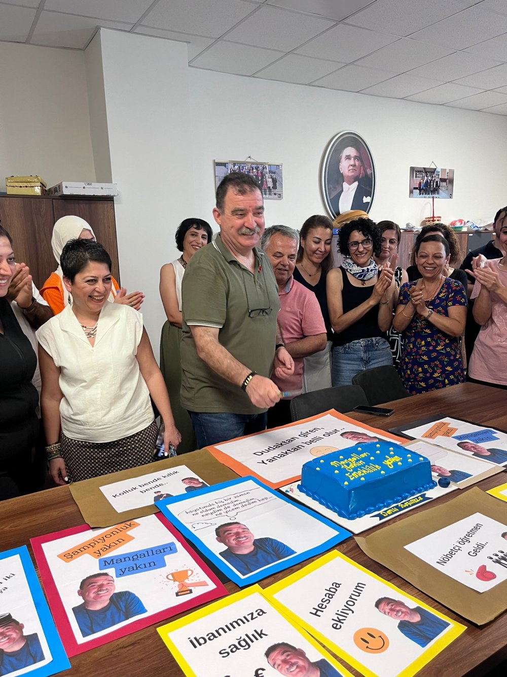 Öğrencilerin vedasının ardından ikinci bir sürpriz de meslektaşları ve okul idaresi tarafından geldi. Öğretmenler odasında gerçekleşen sürpriz veda töreninde pasta kesildi ve bütün meslektaşları tarafından İhsan öğretmene güzel dilekler iletildi.