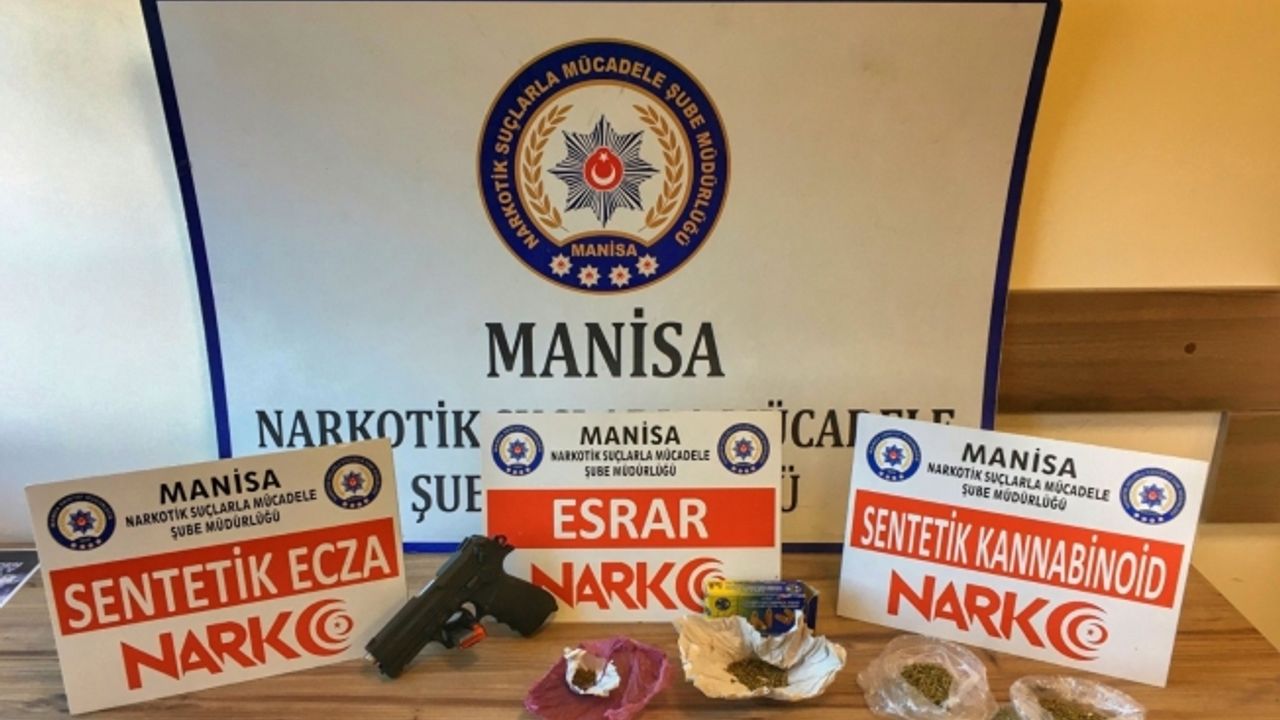 Manisa İl Emniyet Müdürlüğü Narkotik Suçlarla Mücadele Şube Müdürlüğü, il genelinde uyuşturucu madde imalatı ve ticaretine geçit vermiyor. Uyuşturucu madde imalatı ve ticaretinin önüne geçilmesi amacıyla yürütülen çalışmalar kapsamında ekipler Yunusemre ilçesine bağlı 3 farklı adrese eş zamanlı operasyon düzenledi. Düzenlenen operasyonda 76,84 gram bonzai, 2,89 gram esrar, toplam 129 adet sentetik ecza, 2 adet ekstasy hap, 1 adet ruhsatsız tabanca ile 12 adet fişek ele geçirildi.