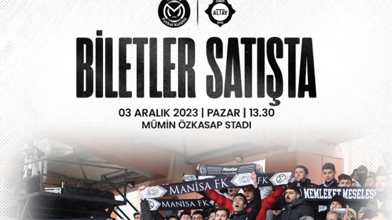 Trendyol 1. Lig 14. hafta mücadelesinde Manisa Futbol Kulübü, 3 Aralık Pazar günü saat 13.30’da Mümin Özkasap Stadı’nda Altay’ı konuk edecek. Karşılaşmanın biletleri www.passo.com.tr ve Passo mobil uygulaması üzerinden satışa çıktı. Karşılaşmanın bilet fiyatları ise şöyle; Kapalı Tribün: 30 TL, Kale Arkası Tribünü: 20 TL, Misafir Tribünü: 25 TL.
