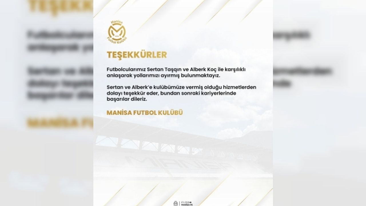 Manisa FK’ın resmi sosyal medya hesabından yapılan açıklamada, "Futbolcularımız Sertan Taşqın ve Alberk Koç ile karşılıklı anlaşarak yollarımızı ayırmış bulunmaktayız. Sertan ve Alberk’e kulübümüze vermiş olduğu hizmetlerden dolayı teşekkür eder, bundan sonraki kariyerlerinde başarılar dileriz" ifadelerine yer verildi.