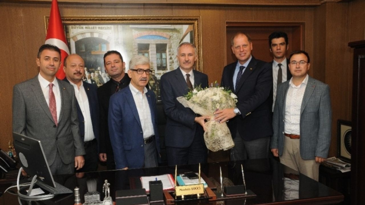 Manisa Ticaret Borsası yönetimi, görevlerine yeni atanan Manisa 1. Komando Eğitim Tugay Komutanı Piyade Albay Sebahattin Kalkan ve Manisa İl Milli Eğitim Müdürü Mustafa Dikici’yi ziyaret ederek, görevlerinde başarılar diledi. İlk olarak Manisa 1. Komando Eğitim Tugay Komutanı Piyade Albay Sebahattin Kalkan’ı ziyaret eden Manisa Ticaret Borsası Yönetim Kurulu Başkanı Sadık Özkasap’a beraberinde Meclis Başkanı Cahit Yayman, yönetim kurulu başkan yardımcıları Alpaslan Gül ve Hüseyin Şenay, meclis üyeleri Reşat Korguz ve İbrahim Külahlı eşlik etti. Ziyarette, Manisa’nın genel sosyo-ekonomik yapısı, ülke ekonomisine üretim ve ihracat faaliyetleriyle katkısı ve gelişimi ile ilgili hususlar konuşuldu. Manisa Ticaret Borsası Yönetim Kurulu Başkanı Sadık Özkasap şunları ifade etti:“Son yıllardaki gelişmeler hepimize göstermiştir ki, çok daha güçlü olmak, birbirimizi daha fazla desteklemek zorundayız. Manisa iş dünyasının temsilcileri olarak huzur olmadan ticaret, ticaret olmadan kalkınma, kalkınma olmadan da sosyal refahın istenilen ölçüde ve hızda olamayacağını düşünüyoruz. Ülkemizin de güvenlik, birlik ve ekonomi temelinde; gücümüzü ve kalkınmamızı ilgilendiren iç ve dış kaynaklı tüm sorun ve zorlukların üstesinden geleceğine inanıyoruz. Manisa’mız da üzerine düşeni yaparak, tüm zorluklara rağmen üretmeye devam ediyor. Tugay komutanlığımız da sağladıkları güven ortamıyla, milli gelir üretiminin aralıksız sürdürülmesi için bizlere büyük destek ve cesaret veriyor. Bizler de tüm Türk Silahlı Kuvvetleri mensuplarına görevlerinde başarılar diliyor, tüm şehitlerimizi rahmetle, tüm gazilerimizi minnetle bir defa daha anıyoruz”