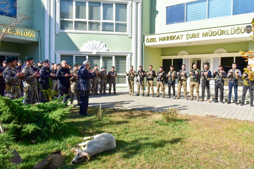 Manisa İl Emniyet Müdürlüğü Özel Harekat Şube Müdürlüğü personelleri Suriye’nin Afrin kentinde devam eden operasyonlara katılacak. Manisa İl Emniyet Müdürü Fahri Aktaş, Manisa İl Müftüsü Şükrü Kabukçu ve personeller Suriye’nin Afrin kentinde terörle mücadele kapsamında görev alacak özel harekat personelleri için dua okudu. Okunan duaların ardından personeller için kurban kesildi. Emniyet Müdür Aktaş, Müftü Kabukçu ve emniyet personelleri özel harekat polislerini dualarla görev bölgesine uğurladı.