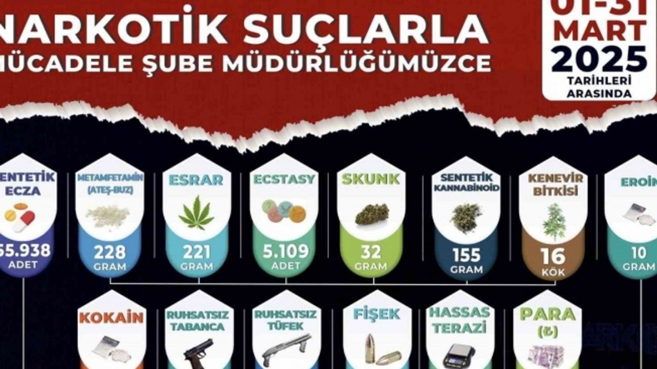 Manisa İl Emniyet Müdürlüğü Narkotik Suçlarla Mücadele Şube Müdürlüğü koordinesinde Akhisar, Salihli, Soma ve Turgutlu Narkotik Suçlarla Mücadele Büro Amirliklerinin de katılımıyla 1-31 Mart tarihleri arasında il genelinde uyuşturucu ile mücadele kapsamında çok sayıda operasyon gerçekleştirildi. Yapılan çalışmalarda 306 olayla ilgili yakalanan 399 şüpheliden 74’ü çıkarıldıkları adli makamlarca tutuklandı. Operasyonlarda 769 bin 440 adet makaron, 55 bin 938 adet sentetik ecza hap, 5 bin 109 adet ecstasy hap, 228 gram metamfetamin, 221 gram esrar, 103 gram sentetik kannabinoid (bonzai) hammaddesi, 52 gram sentetik kannabinoid, 32 gram skunk, 10 gram eroin, 1 gram kokain, 16 kök Hint keneviri, 3 adet ruhsatsız tabanca, 2 adet ruhsatsız av tüfeği, 27 adet fişek, 6 adet hassas terazi ve 51 bin 760 TL uyuşturucu ticaretinden elde edildiği değerlendirilen para ele geçirildi.