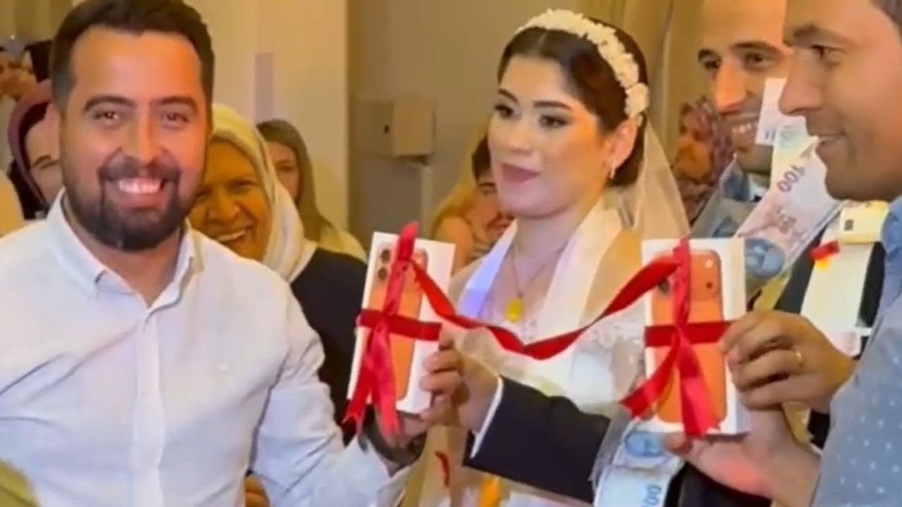 Manisa’nın Turgutlu ilçesindeki bir düğünde damadın arkadaşları, gelenekselleşmiş altın takısı yerine gelin ve damada son model bir iPhone hediye ederek tüm davetlileri şaşırttı.