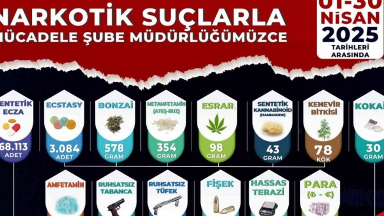 Gerçekleştirilen operasyonlarda çok sayıda uyuşturucu madde ve suç unsuru ele geçirildi. Nisan ayında yapılan operasyonlarda, 68 bin 113 adet sentetik ecza, 3 bin 84 adet ecstasy, 578 gram bonzai, 354 gram metamfetamin (ateş-buz), 98 gram esrar, 43 gram sentetik kannabinoid (ham madde), 78 kök kenevir bitkisi, 30 gram kokain, 26 gram amfetamin ele geçirildiği açıklandı.